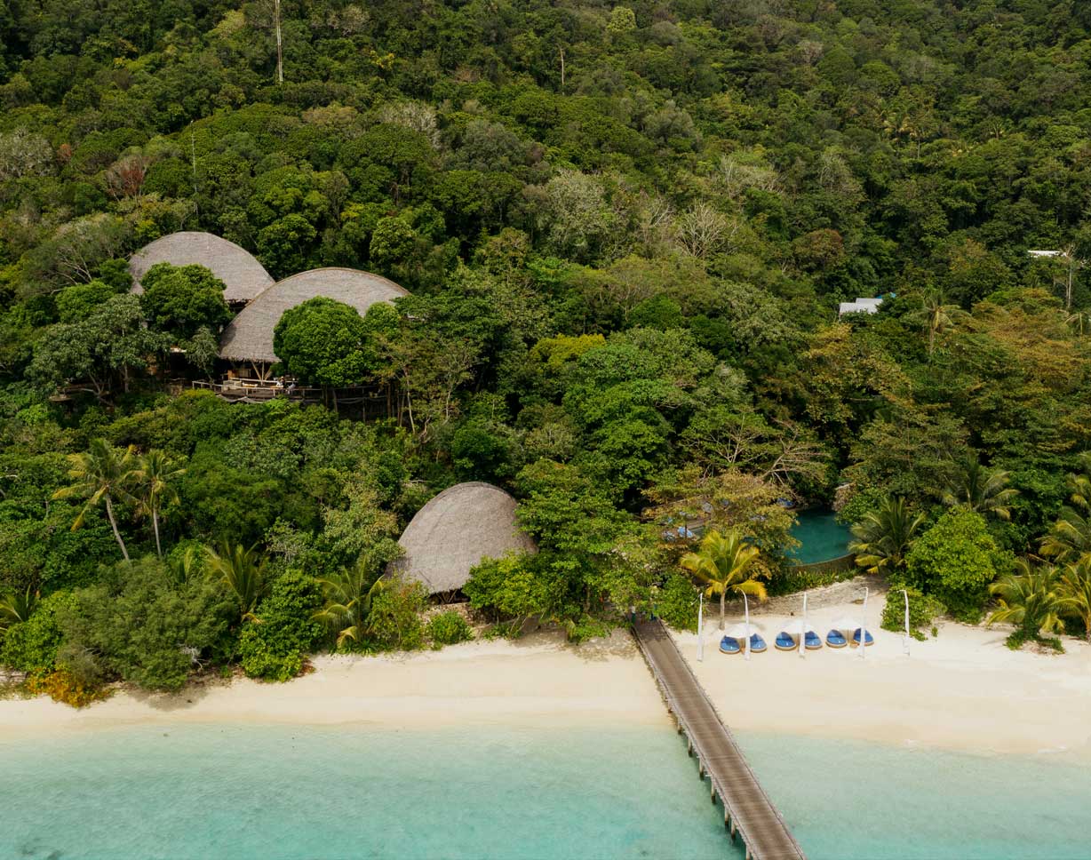 Ενσωματωμένο στο μοναδικό περιβάλλον των πέντε νησιών και 13 μαγευτικών παραλιών, το retreat υπηρετεί τη βιωσιμότητα ενός τόπου που μένει απαράλλαχτος εδώ και 10.000 χρόνια. Μονοπάτια χαραγμένα στην άμμο οδηγούν, μέσα από ψηλούς φοίνικες, στις 35 εκπληκτικές, οικολογικές βίλες -άλλες κρυμμένες στη βλάστηση, άλλες λίγα βήματα από την κατάλευκη αμμουδιά κι άλλες πάνω σε πασσάλους, εν μέσω της τιρκουάζ θάλασσας.