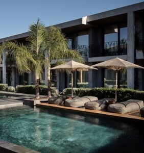 Ξεχωρίζει η καταγάλανη πισίνα υπερχείλισης με τις μαλακές ξαπλώστρες.