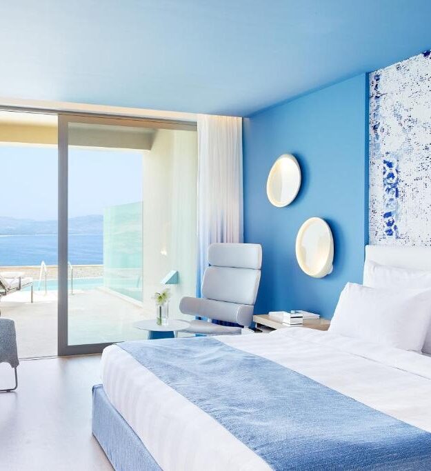Μία θαυμάσια, ιδιωτική παραλία, δύο πισίνες με γλυκό νερό, υπερσύγχρονο σπα, γήπεδο τένις, άνετα δωμάτια, σουίτες και υπερπολυτελείς βίλες που βρίσκονται μέσα στην υπέροχη φύση του νησιού και έχουν το δικό τους, ιδιωτικό αίθριο και πανοραμική θέα στον Κόλπο των Βλυχών. Ακόμα, μη χάσετε την ευκαιρία να βουτήξετε στην εσωτερική θερμαινόμενη πισίνα ή να απολαύσετε κάποιες από τις εξειδικευμένες υπηρεσίες του Spa & Health Club, από περιποιήσεις προσώπου και σώματος μέχρι σάουνα ή ατμόλουτρο.