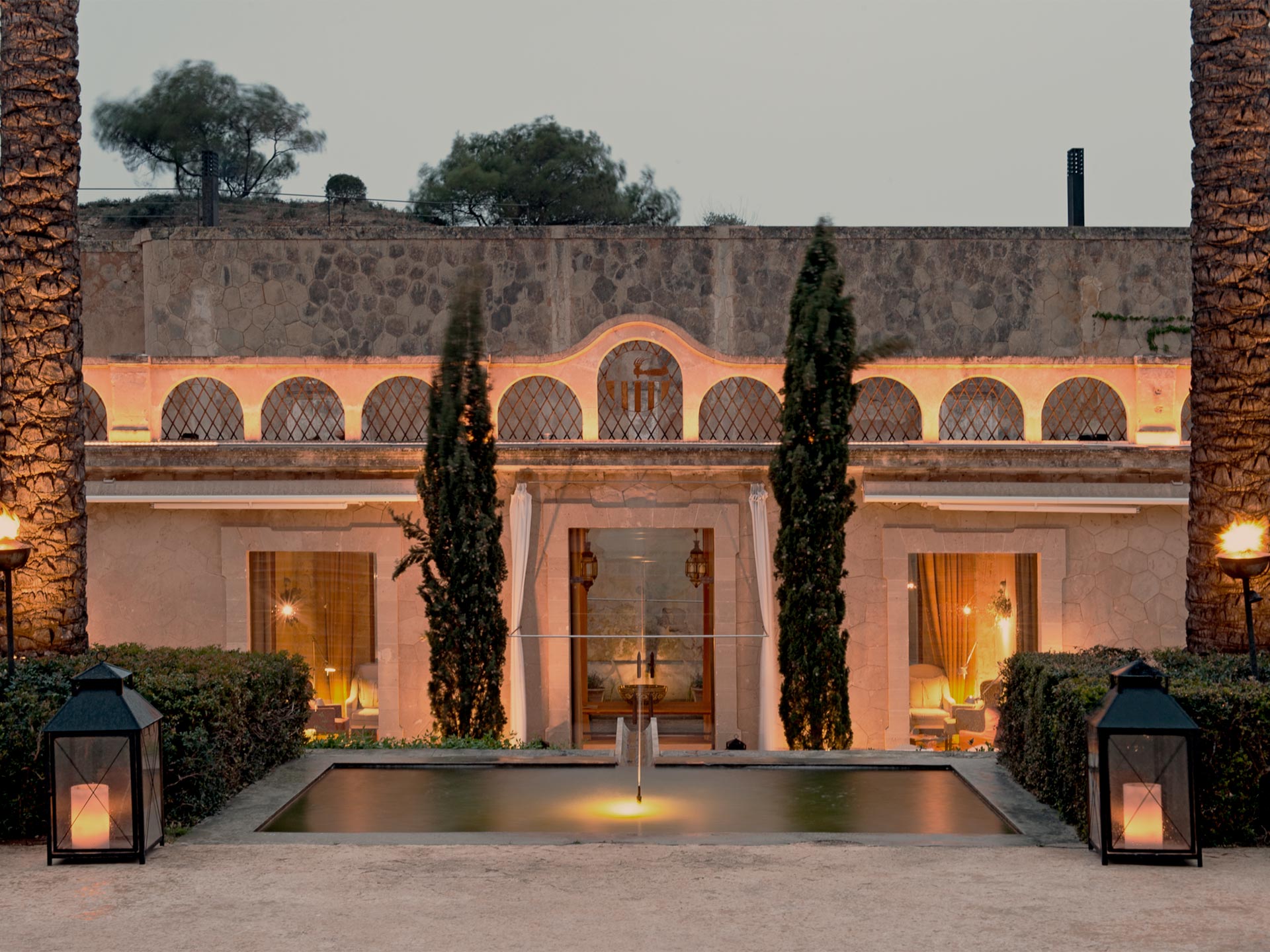 Οι πέτρινοι τοίχοι και τα ξύλινα ταβάνια προσδίδουν μία «γήινη» αίσθηση. Ίσα ίσα για να δώσουν «συγχωροχάρτι» στην πολυμέλεια των μαρμάρινων πατωμάτων και των κρεβατιών με θέα στις ιδιωτικές βεράντες με τις πισίνες και τις αιώρες. Όλα αυτά λίγο μακριά από το βαθύ μπλε του κόλπου της Πάλμα Ντε Μαγιόρκα.