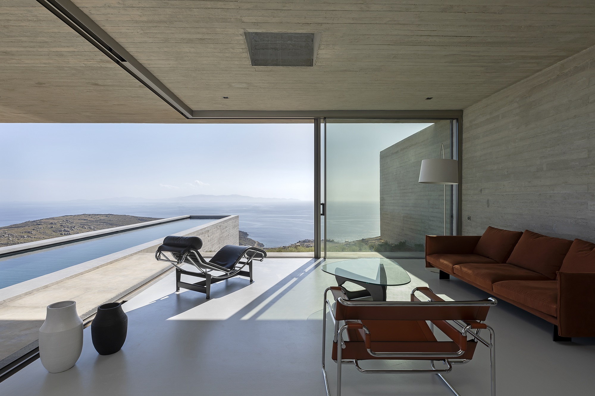 Η διάσπαση ενός κτηριακού όγκου σε τρία επιμέρους υπόσκαφα τμήματα έχει σκοπό την πλήρη ένταξή της στην τοπιογραφία της περιοχής. Το αποτέλεσμα είναι μια εντυπωσιακή βίλα, που αποκαλύπτει το κυκλαδικό τοπίο μέσω σύγχρονης μινιμαλιστικής αισθητικής, επιτυγχάνοντας την ένταξη της αρχιτεκτονικής στο φυσικό τοπίο.