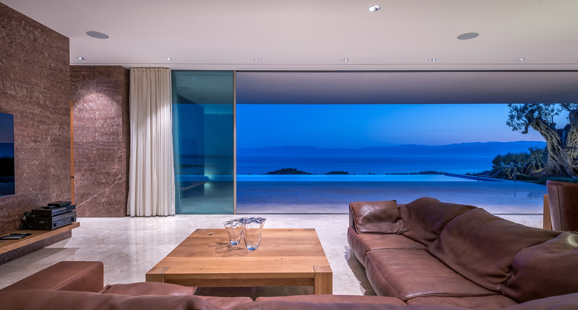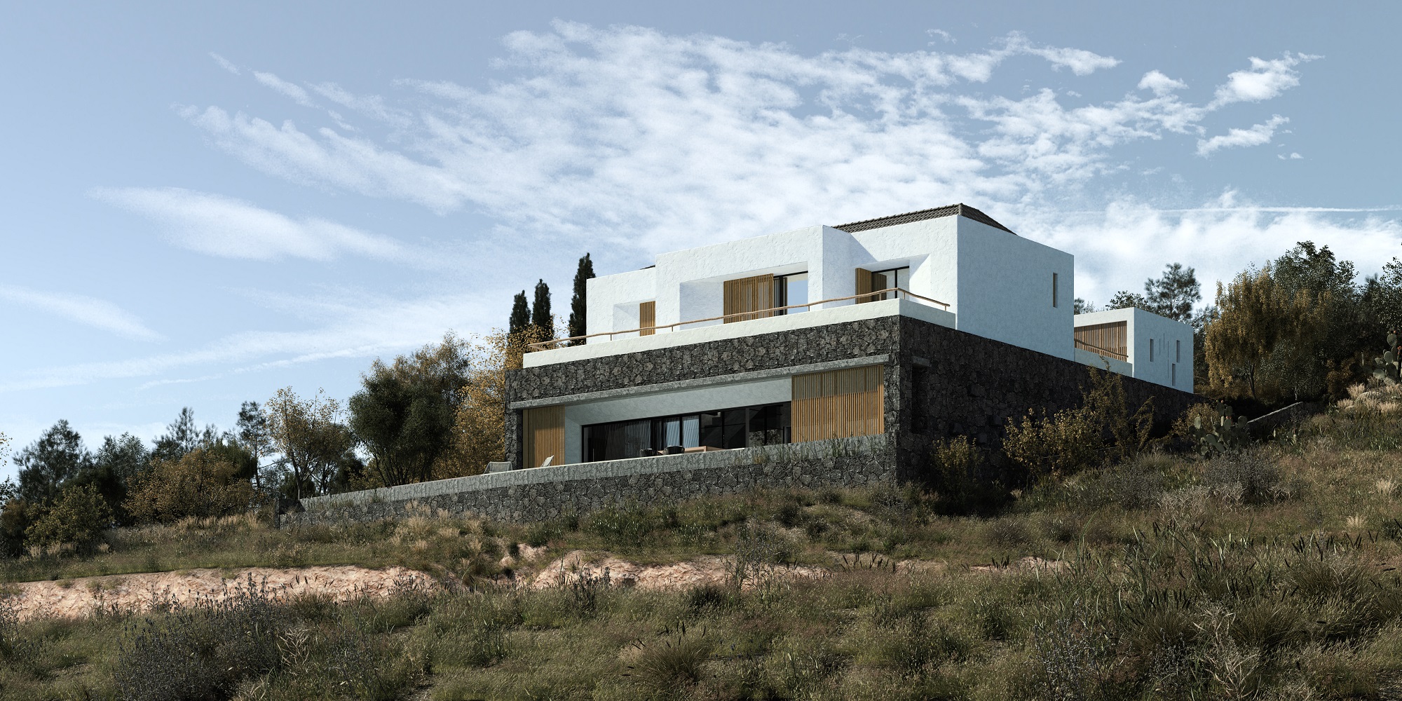 Η κλίση του οικοπέδου αγκαλιάζει το κτήριο δημιουργώντας την αίσθηση ότι υπήρχε πάντα στο τοπίο. Οι λιτές γραμμές και η χρήση φυσικών υλικών δημιουργούν μια απέριττη, διαχρονική αρχιτεκτονική πρόταση.