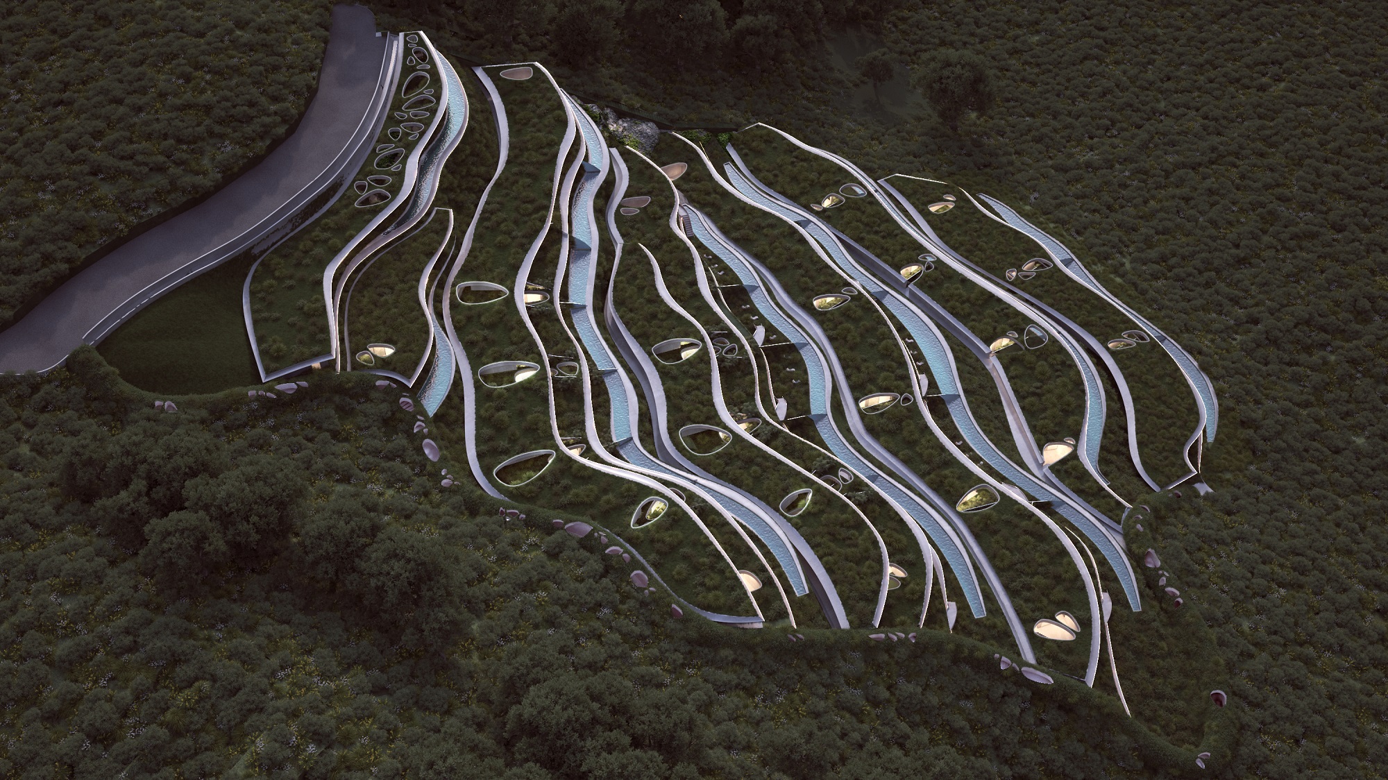 Η αρχιτεκτονική «ιδέα» αποδίδει, σε πραγματολογικό και συμβολικό επίπεδο, αφενός τον κυματοειδή χαρακτήρα του εδαφικού ανάγλυφου του Τόπου, και αφετέρου την ιστορική μεταφορά, «σκηνοθετώντας» στον χώρο κτηριακούς όγκους σε «κίνηση», σαν πέτρινα λαξεύματα σε μεγάλη κλίμακα, που αποτελούν αναπόσπαστη συνέχεια του φυσικού πανοράματος.
