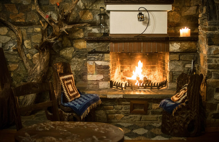 Στο ίδιο ύφος κινείται και το καθιστικό με το τζάκι, τα όμορφα χαλιά και τους καναπέδες που έχουν τοποθετηθεί περιμετρικά του χώρου κι έχουν επενδυθεί με αφράτα μαξιλάρια.