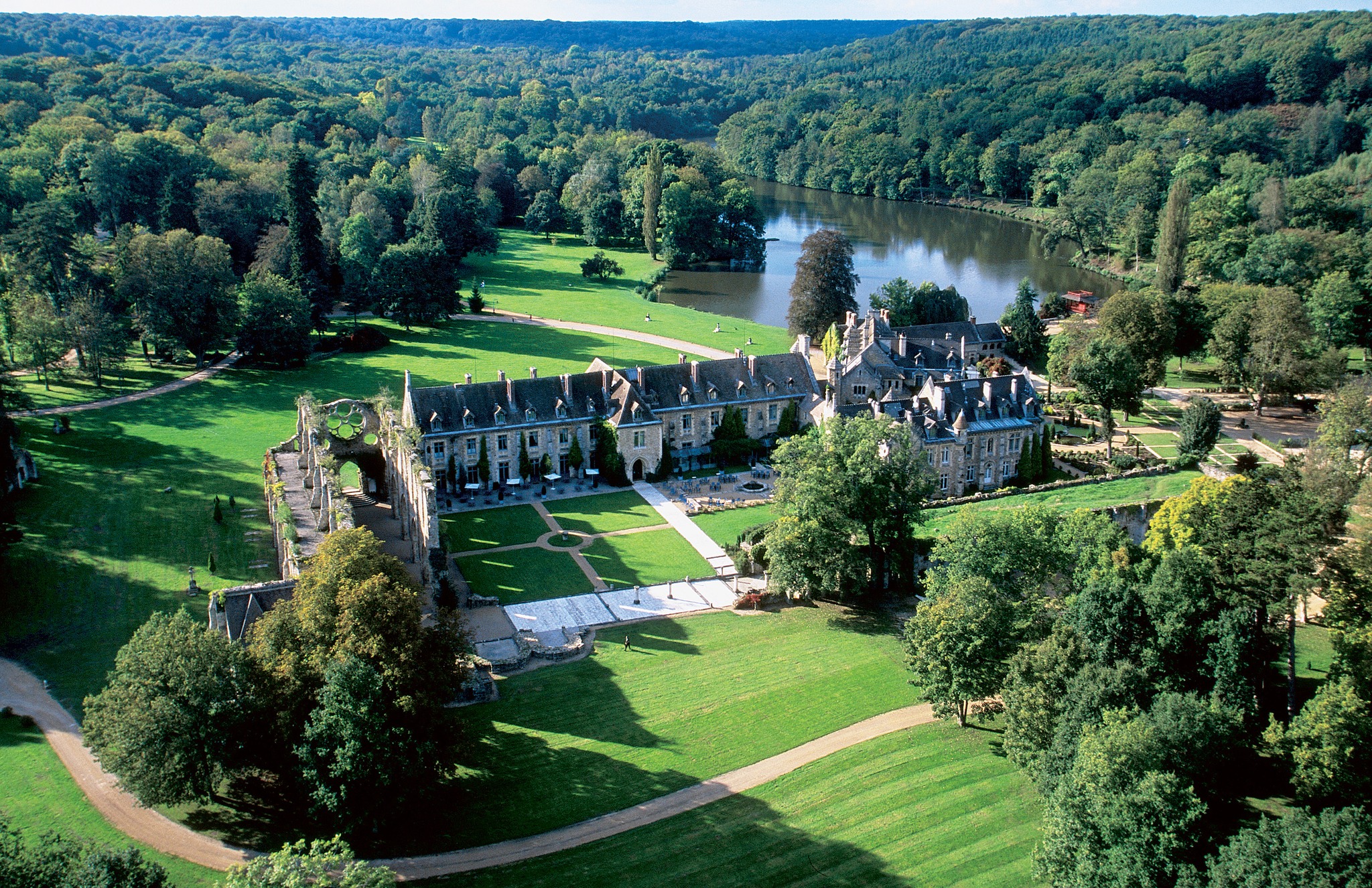 Μόλις 45΄ νοτιοδυτικά της γαλλικής πρωτεύουσας στην επονομαζόμενη «Νήσο της Γαλλίας», ή αλλιώς «παριζιάνικη περιοχή», και διαμέσου της κοιλάδας Chevreuse αυτό το πρώην Κιστερκιανό Αββαείο του 12ου αιώνα -που μετέπειτα πέρασε στην κατοχή της οικογένειας Rothschild- υπέστη μια εκ βάθρων ανακαίνιση ύψους 60εκ.€ που διήρκησε τέσσερα χρόνια, ώστε να μεταμορφωθεί σε ξενοδοχείο που αποπνέει την αίσθηση μιας αποκλειστικής λέσχης για εκλεκτά μέλη. Συνδυάζοντας τη γοητεία μιας βρετανικής εξοχικής έπαυλης με μια δόση παριζιάνικης κομψότητας, διαθέτει 145 δωμάτια και σουίτες που φέρουν την υπογραφή της Cordélia de Castellane, καλλιτεχνικής διευθύντριας του Dior Maison. Πηγή της έμπνευσής της υπήρξε η ίδια πλούσια ιστορία του κτηρίου, ώστε να δώσει πνοή ζωής σε κάθε χώρο, συνταιριάζοντας ζωηρούς, θερμούς τόνους με ντελικάτα μοτίβα και προσεκτικά επιλεγμένα έπιπλα με αυθεντικά έργα τέχνης: επενδύσεις από σκούρο ξύλο, μαρμάρινα τζάκια, φλοράλ ταπετσαρίες του William Morris, λεοπάρ χαλιά και λαμπατέρ με σκωτσέζικα καρώ, αν και φαινομενικά αταίριαστα, δημιουργούν μια συναρπαστικά θεατρική ατμόσφαιρα.