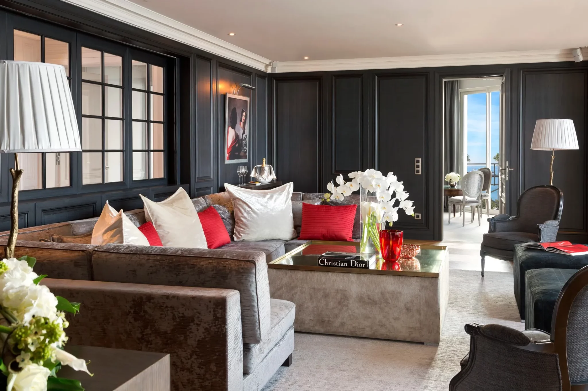 Ως επιτομή του glamour, η Christian Dior Suite, αποτελεί μία από τις πιο επιβλητικές και περιζήτητες σουίτες ολόκληρης της Croisette. Με ανεμπόδιστη θέα στη Μεσόγειο, η σουίτα αποτυπώνει με ακρίβεια τους κώδικες του εμβληματικού οίκου μόδας μέσα από μια σύγχρονη ερμηνεία της απόλυτα chic αισθητικής του, ενώ είναι η μοναδική στην Ευρώπη που φέρει τη σφραγίδα του. Έπιπλα Louis XVI συνδυάζονται αρμονικά με μοντέρνες γραμμές, η ροτόντα του σαλονιού είναι εμπνευσμένη από το ταβάνι της boutique στην Avenue Montaigne, οι γκρι τόνοι φωτίζονται από κόκκινα μαξιλάρια, ενώ υπάρχει ακόμη κι ένα πιστό αντίγραφο του προσωπικού γραφείου του ίδιου του Christian Dior. Οι μούσες του οίκου, όπως η Charlize Theron, η Kirsten Dunst και η Bella Hadid, που έχουν φιλοξενηθεί στα 450 τ.μ. της, προσδίδουν στη σουίτα ακόμη πιο θρυλικό status.