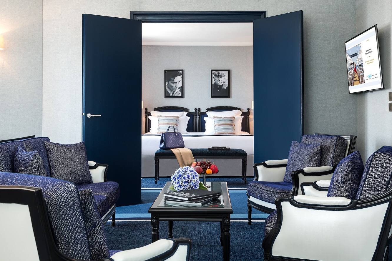 Η Cristian Dior δεν είναι η μόνη εκθαμβωτική σουίτα του Le Majestic, η Mélodie Suite, ατενίζει την Κυανή Ακτή και επίσης συγκαταλέγεται στις πιο εντυπωσιακές σουίτες των Καννών. Η διακόσμησή της αντλεί έμπνευση από την ταινία «Mélodie en sous-sol» του Henri Verneuil με τους Jean Gabin και Alain Delon, σκηνές της οποίας γυρίστηκαν στο ξενοδοχείο το 1963, ενώ τα πορτραίτα των δύο θρύλων του κινηματογράφου και οι φωτογραφίες από τα γυρίσματα που κοσμούν τους τοίχους, προσθέτουν μια διακριτική, νοσταλγική αίσθηση glamour. Στον 7ο και τελευταίο όροφο του ξενοδοχείου όπου απλώνονται τα 150 τ.μ. της, βρίσκει κανείς ένα ιδιωτικό καταφύγιο που αναβιώνει τη χρυσή εποχή του γαλλικού σινεμά κι όπου οι σύγχρονες ανέσεις και η πολυτέλεια συνυπάρχουν αρμονικά. Σε τοίχους, πόρτες, έπιπλα και χαλιά κυριαρχεί το βαθύ μπλε, αλλά είναι το ημικυκλικό παράθυρο στο ευρύχωρο σαλόνι που κλέβει την παράσταση, αφήνοντας θαρρείς τη Μεσόγειο να εισβάλλει στον χώρο.