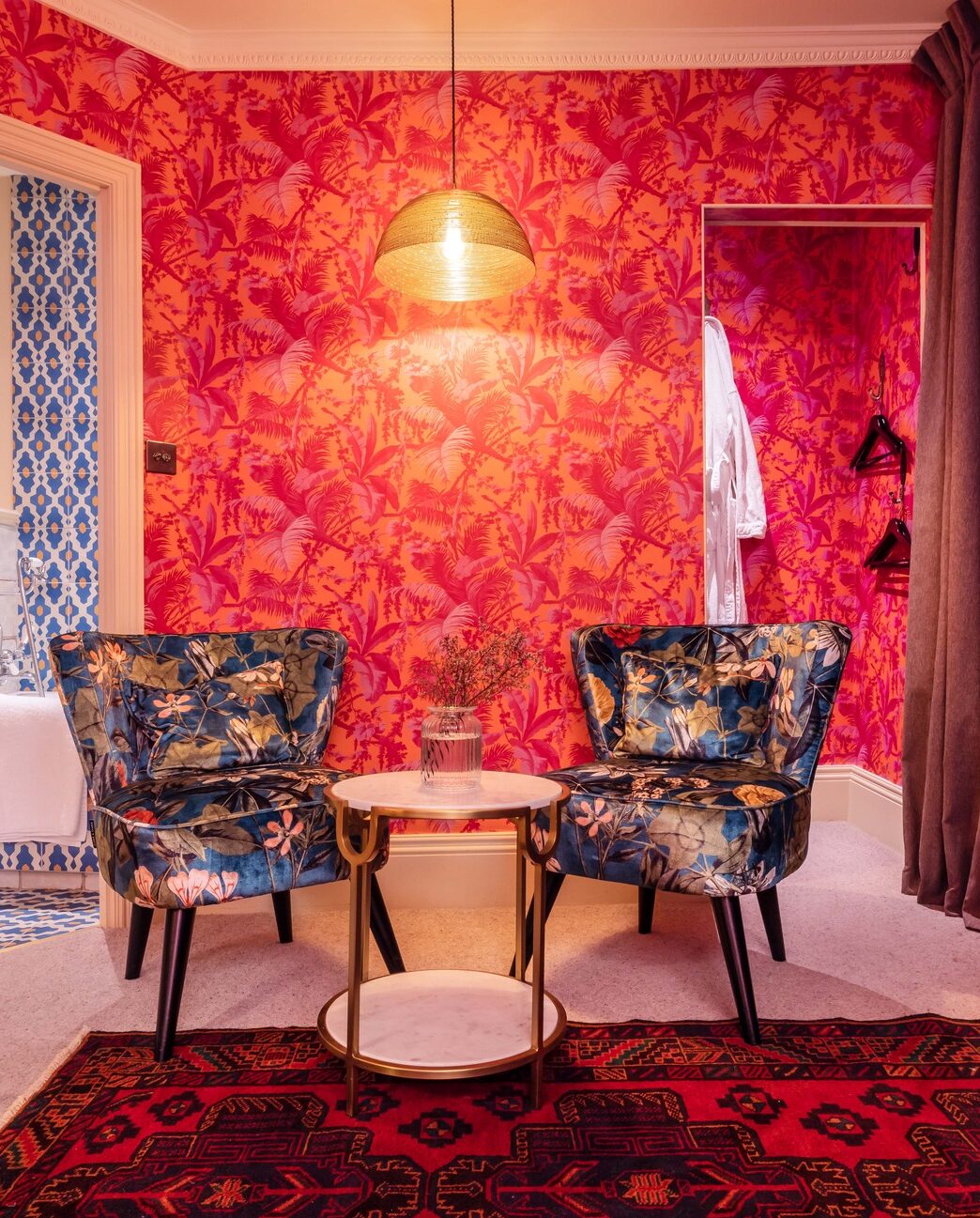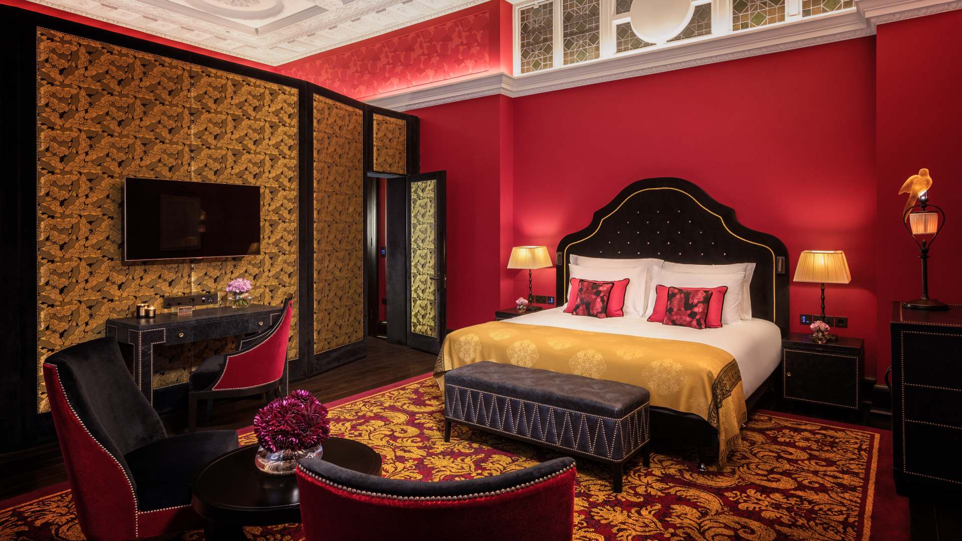Κάθε γωνιά επιφυλάσσει και μια σκανδαλιστική έκπληξη. Το lobby μοιάζει με βιβλιοθήκη στο σαλόνι ενός τζέντλεμαν: από τη μια οι «Επιστολές του Horace Walpole» που κοσμούν τα ράφια κι από την άλλη μπορντό βελούδινα πουφ με κρόσσια που αγγίζουν το πάτωμα. To κυρίως σαλόνι στην απέναντι πλευρά θυμίζει κάτι από ντίσκο, με το επενδυμένο από καθρέφτες ταβάνι και τα πορτοκαλί LED φώτα. Παρά τις απρόσμενες, ιδιόρρυθμες πινελιές, το κτήριο που ήταν κάποτε εκκλησία βαπτιστών, διατηρεί έναν αέρα μεγαλείου. Τα αυθεντικά βιτρό παράθυρα λούζουν με χρυσαφένιο φως τις σκάλες και καλογυαλισμένες εσοχές κρύβουν αγάλματα νυμφών από μαύρη πέτρα. Ακόμη και ο όρος «μπουντουάρ» αδικεί τα δωμάτια: μαύρο και χρυσό δημιουργούν δραματικές αντιθέσεις, σκούρο ξύλο ντύνει τοίχους και πατώματα, πανύψηλα παραβάν και βελούδινα ανάκλιντρα πλαισιώνουν τα κρεβάτια, ενώ κρυφοί φωτισμοί και φωτιστικά σε σχήμα κολιμπρί φροντίζουν για την υποβλητική ατμόσφαιρα.