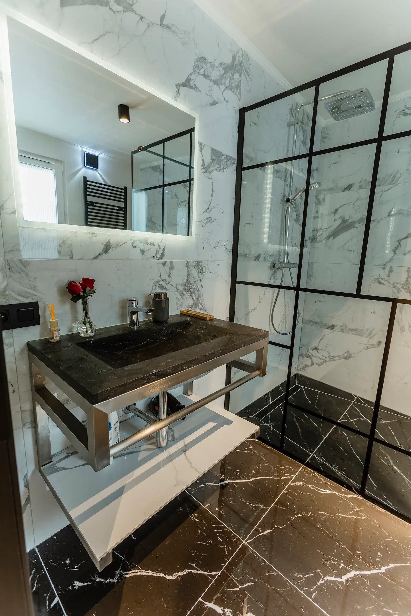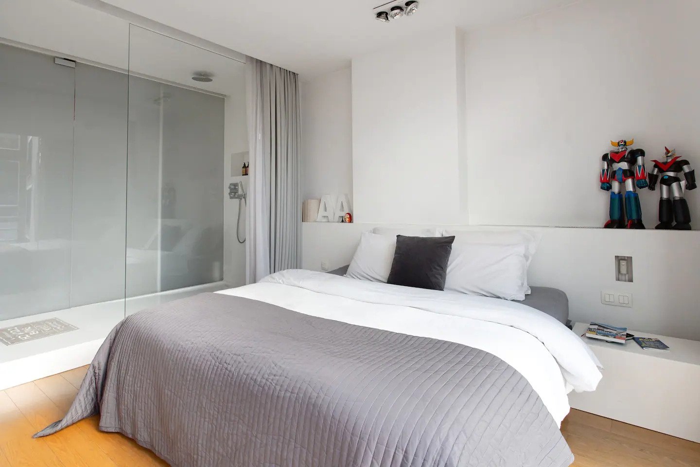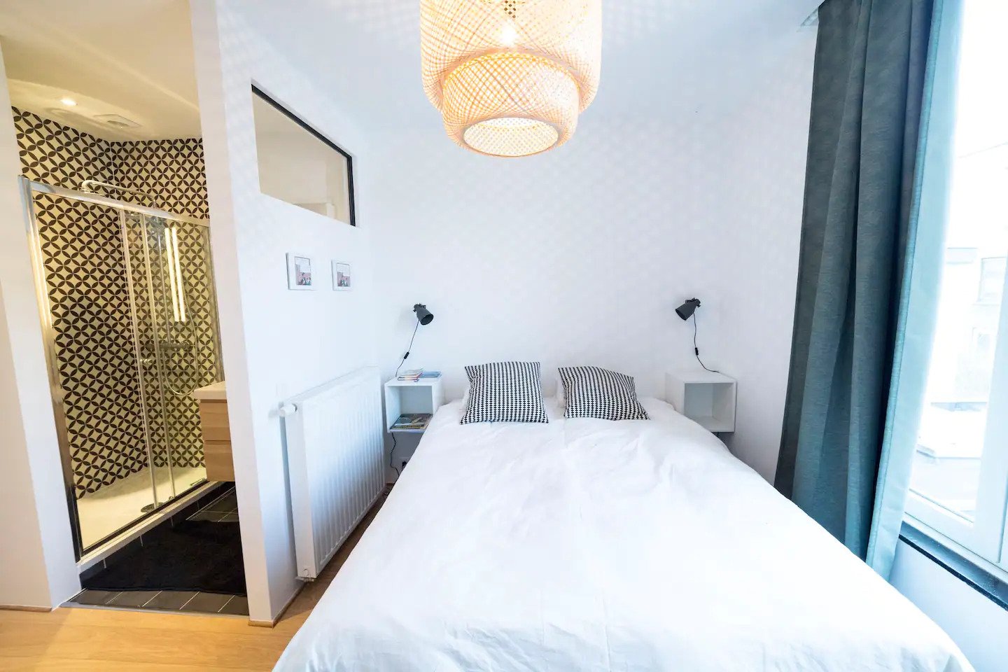 Στην κρεβατοκάμαρα, το διπλό κρεβάτι είναι κοντά σε ένα μεγάλο παράθυρο, άρα αν θέλετε μπορείτε να ξυπνήσετε από το φως του ηλίου, ειδάλλως υπάρχουν σκούρες κουρτίνες. Κάτι άλλο που ξεχωρίζει το κατάλυμα είναι τα κομψά φωτιστικά και ο πολυέλαιος. Η κρεβατοκάμαρα επικοινωνεί με το μπάνιο στο οποίο υπάρχει wetroom με τους τοίχους να είναι διακοσμημένοι με γεωμετρικά prints.