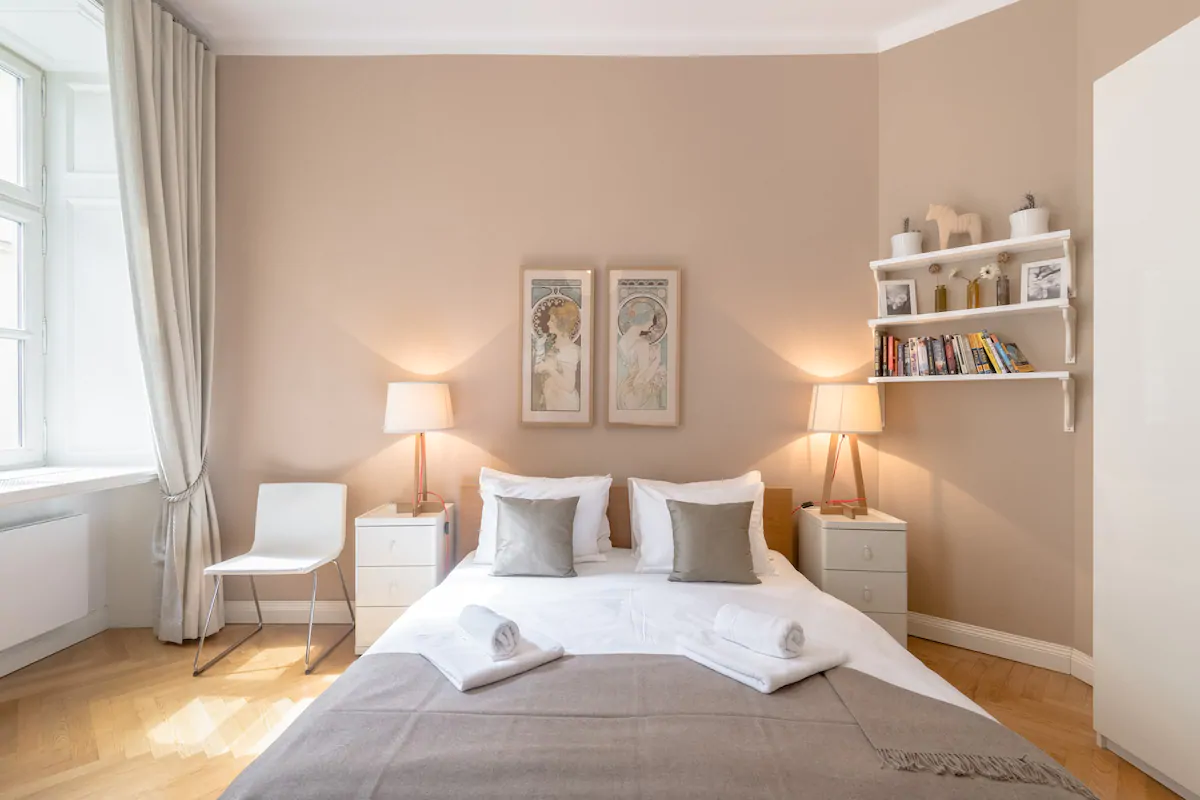 Σίγουρα, το συγκεκριμένο διαμέρισμα είναι μία από τις πιο πολυτελείς επιλογές διαμονής στην τσεχική πρωτεύουσα και θα ικανοποιήσει και τον πιο απαιτητικό επισκέπτη. Μπορεί να φιλοξενήσει έως 6 (5 με άνεση) άτομα, καθώς διαθέτει δύο κρεβατοκάμαρες με δύο king size κρεβάτια καθώς και έναν καναπέ κρεβάτι.
