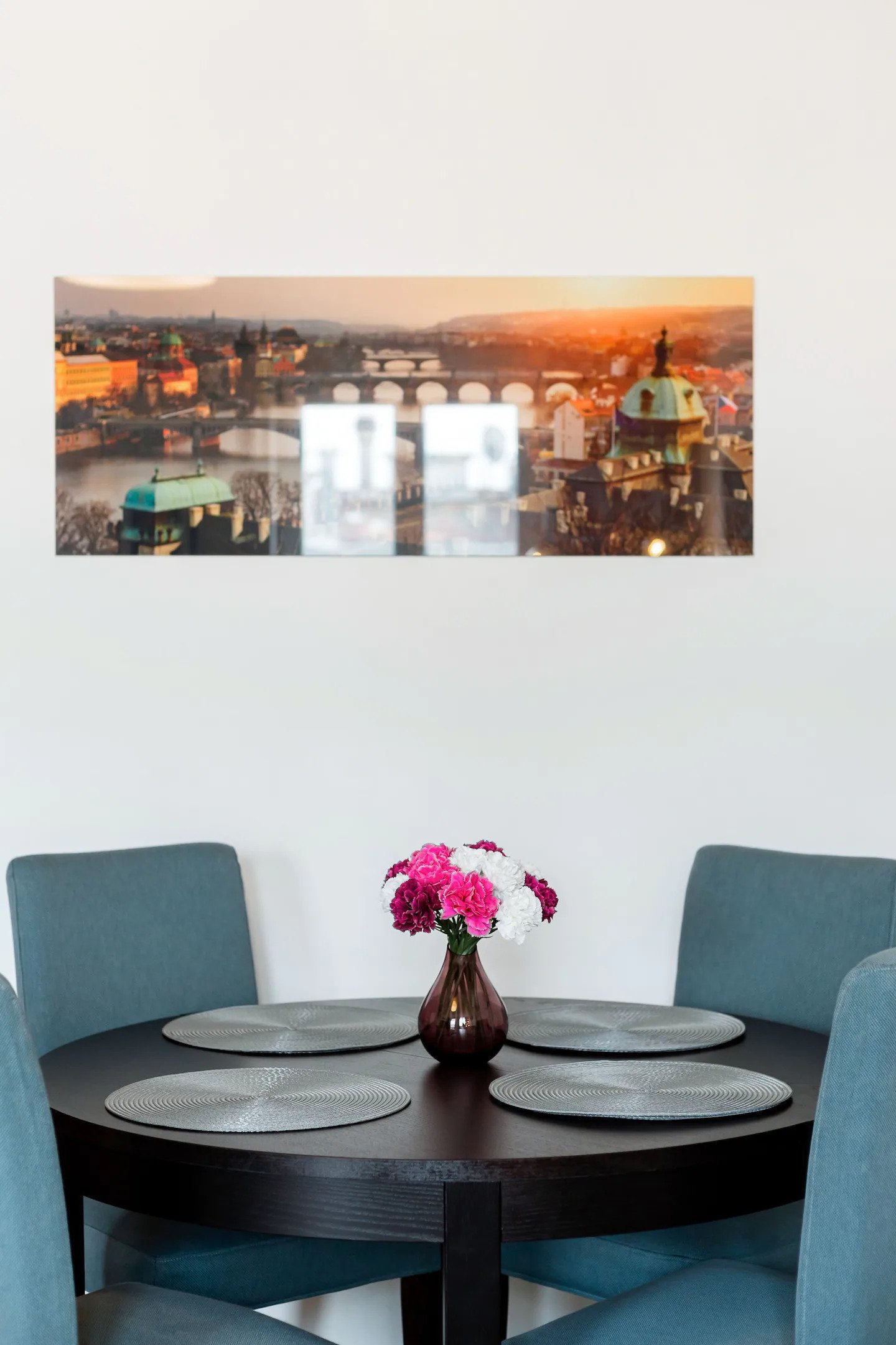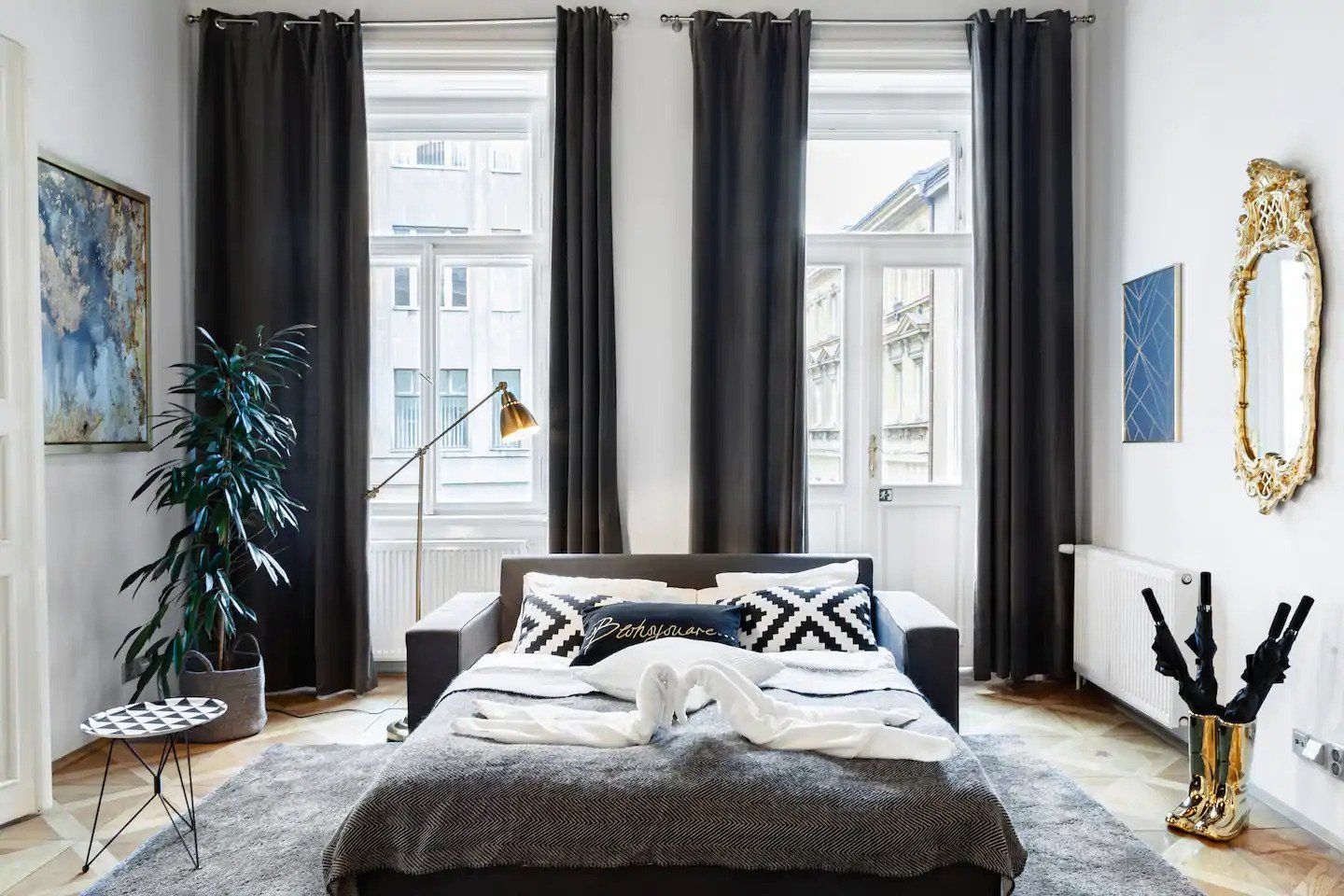 Στη διακόσμησή του περιλαμβάνονται κρυστάλλινοι πολυέλαιοι, χρυσές πινελιές, vintage τζάκια και μοντέρνα έργα τέχνης. Στην πλήρως εξοπλισμένη κουζίνα, θα βρείτε επιδαπέδιο φωτισμό, καθώς και πλυντήριο πιάτων όπως και μηχανή εσπρέσο. Ο παρακείμενος χώρος για φαγητό περιλαμβάνει μια τραπεζαρία από ξύλο καθώς και ένα ιδιαίτερο φωτιστικό με τη λέξη «Prague». Από τα πιο εντυπωσιακά στοιχεία του συγκεκριμένου διαμερίσματος είναι το μπάνιο με μαύρο πλακάκι. Όλοι οι χώροι είναι κομψά επιπλωμένοι ενώ το μπαλκόνι προσφέρει υπέροχη θέα στην πόλη. Το διαμέρισμα βρίσκεται πολύ κοντά στη διάσημη πλατεία Wenceslas και προσφέρει εύκολη πρόσβαση σε εστιατόρια, μπουτίκ, μπαρ καθώς και τα μουσεία της Παλιάς Πόλης.