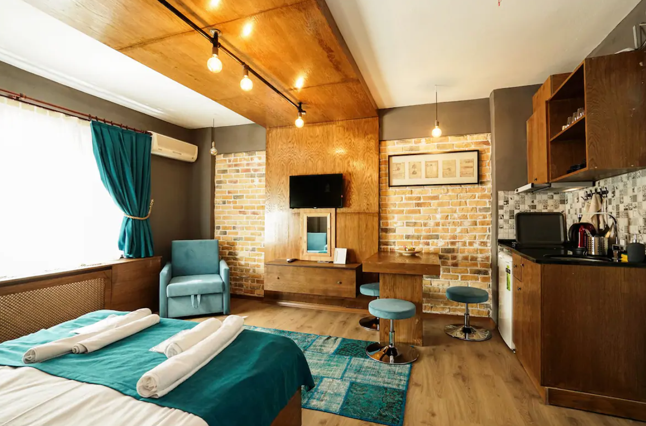 Αν θέλετε να νοικιάσετε ένα διαμέρισμα στην Κωνσταντινούπολη που να προσφέρει luxury διαμονή και παροχές ξενοδοχειακού τύπου, αυτό το εκπληκτικό studio σε ένα υπερσύγχρονο κτίριο είναι μία εξαιρετική επιλογή. Είναι επιπλωμένο με ένα διπλό κρεβάτι καθώς και ένα συρταρωτό κρεβάτι, κάτι που σημαίνει ότι μπορεί να φιλοξενήσει από 1 έως 3 άτομα. Στη διακόσμηση, κυριαρχεί το λαμπερό ξύλο αλλά και οι ανοιχτόχρωμες αποχρώσεις του τιρκουάζ.