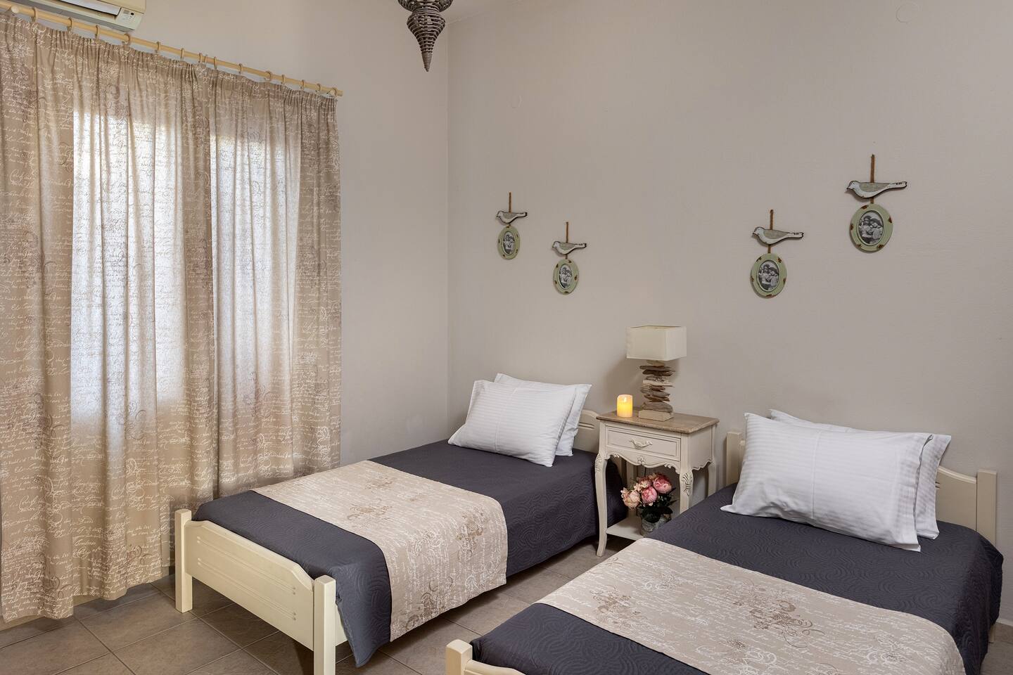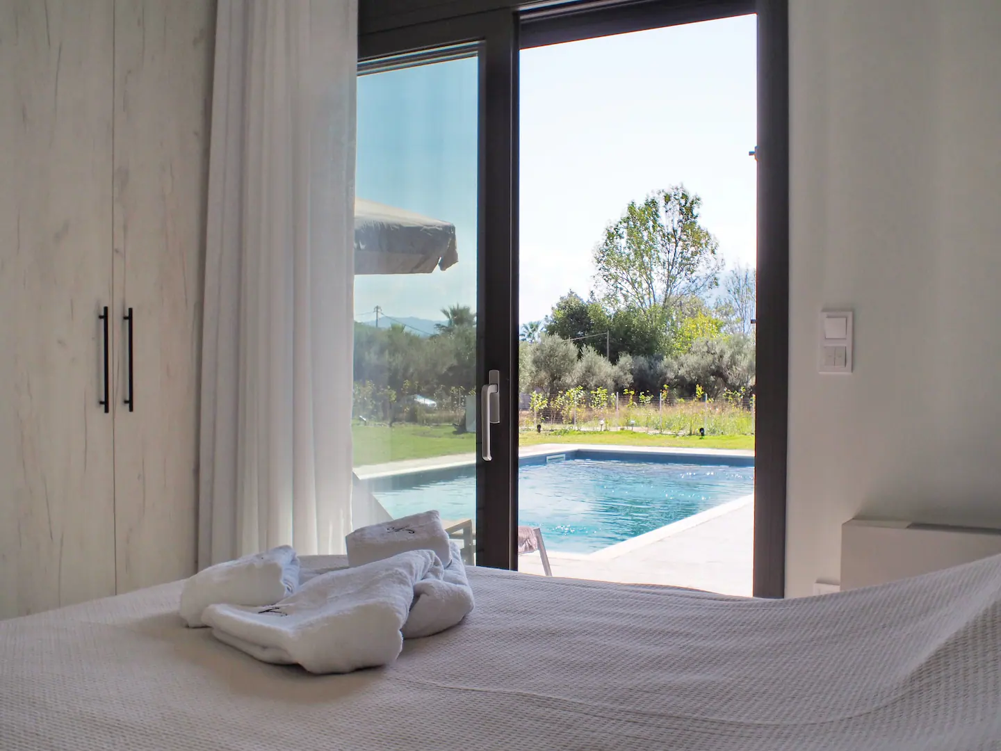Διαθέτει τρία υπνοδωμάτια, δύο μπάνια και όλες τις απαραίτητες ανέσεις για να εξασφαλίσει τη διαμονή σας. Τα υπνοδωμάτια βρίσκονται στο ισόγειο με μεγάλα παράθυρα και άπλετο φυσικό φως. Η βίλα μπορεί να φιλοξενήσει μέχρι 6 άτομα. Υπάρχουν δύο υπνοδωμάτια με διπλό κρεβάτι και ένα με δύο μονά. Τα υπνοδωμάτια έχουν άμεση πρόσβαση στο αίθριο και στον χώρο της πισίνας, προσφέροντάς σας το τέλειο μέρος για να απολαύσετε τον ήλιο. Ο εξωτερικός χώρος της βίλας είναι ένα υπέροχο μέρος για να ξεκουραστείτε και να χαλαρώσετε. Ο ευρύχωρος χώρος της πισίνας παρέχει άφθονες ευκαιρίες για να δροσιστείτε και να απολαύσετε τον ήλιο απολαμβάνοντας το γαλήνιο περιβάλλον της βίλας. Το αίθριο είναι ιδανικό για να πιείτε το αγαπημένο σας αναψυκτικό ή ποτό, απολαμβάνοντας τον καιρό και το καταπράσινο τοπίο, τόσο κατά τη διάρκεια της ημέρας όσο και της νύχτας. Αυτό που όμως κάνει τη βίλα αυτή μοναδική, είναι η Σάουνα «Βαρέλι» εξωτερικού Χώρου.