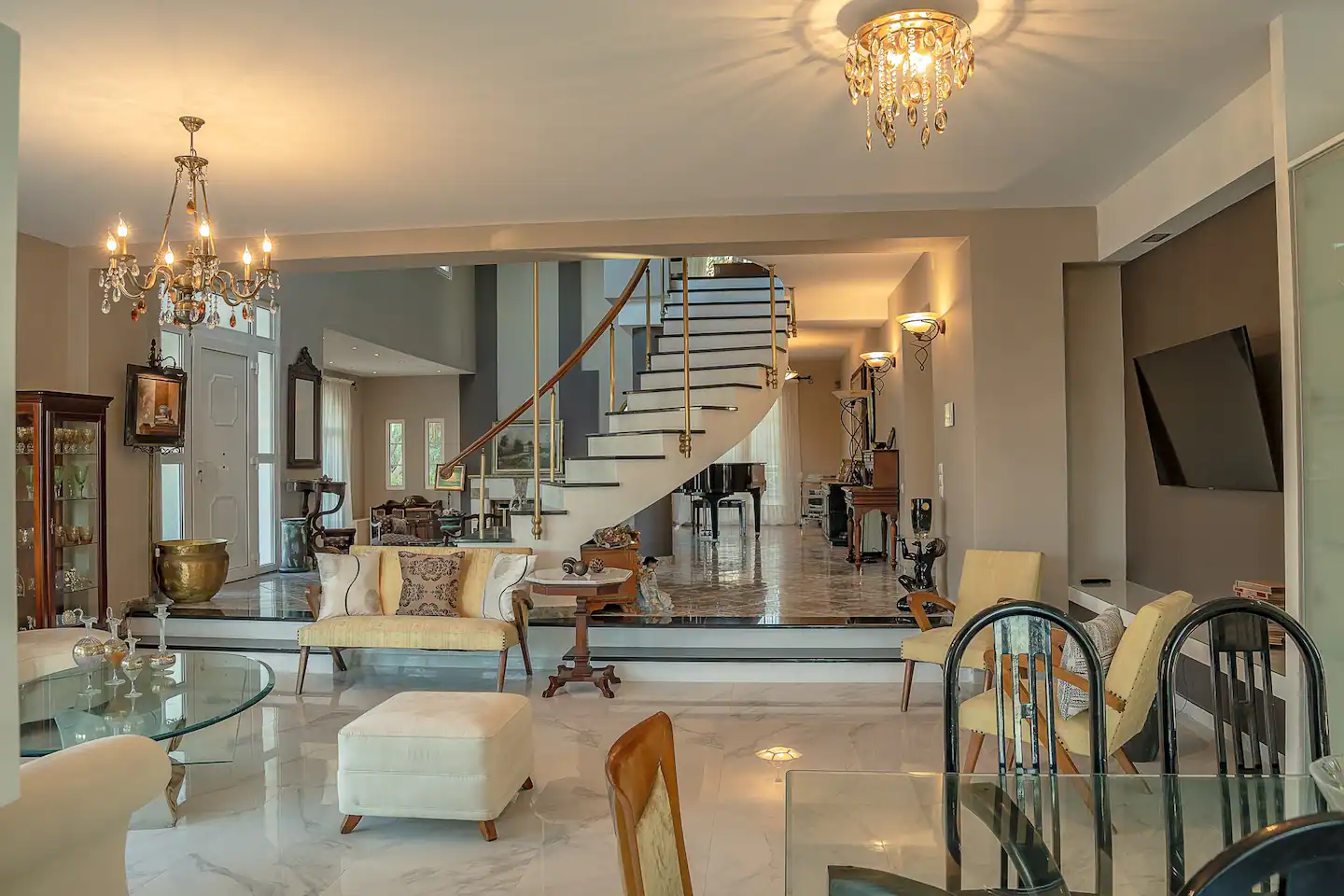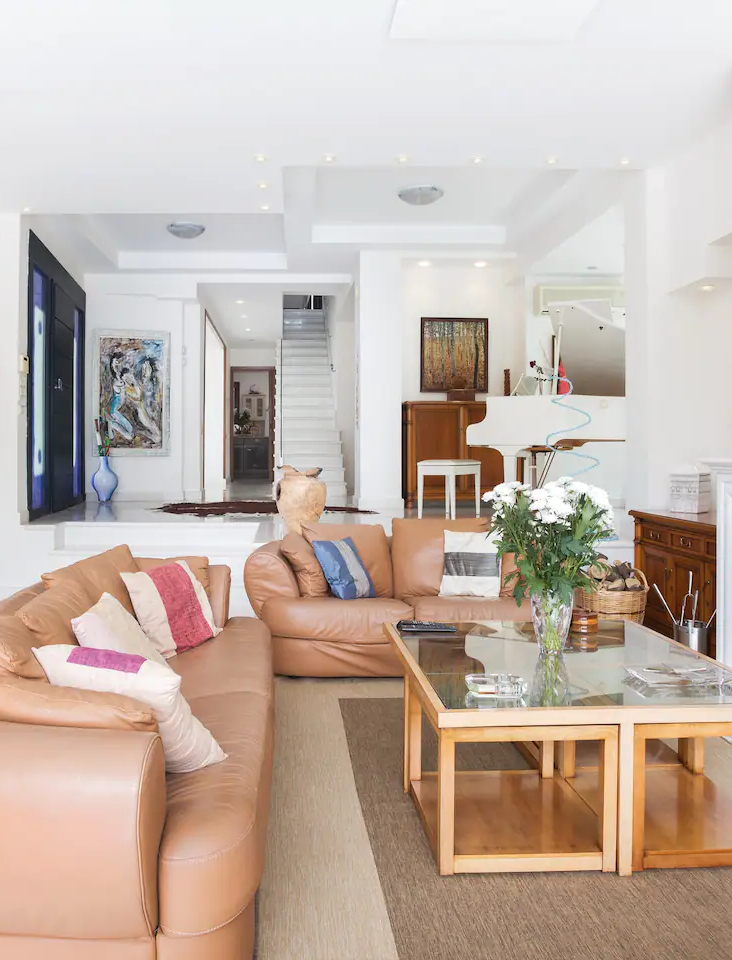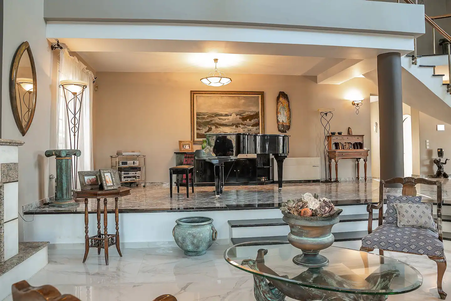 Στην καρδιά της Γλυφάδας, βίλα τριών επιπέδων με ιδιωτική πισίνα και ένα κατάλευκο πιάνο με ουρά στη μέση του σαλονιού, κοντά στη θάλασσα και στο γήπεδο γκολφ, παρουσιάζεται ιδανική για επαγγελματικά ταξίδια ή και για διακοπές. Η βίλα είναι κατάλληλη για μεγάλες οικογένειες ή γκρουπ μουσικών, αφού διαθέτει 7 ευρύχωρα υπνοδωμάτια. Επίσης, οι χώροι της είναι πλήρως εξοπλισμένοι και ενδείκνυνται ακόμη και για ψηφιακούς νομάδες, καθώς προσφέρουν γραφείο με όλα τα απαραίτητα για την απομακρυσμένη εργασία.