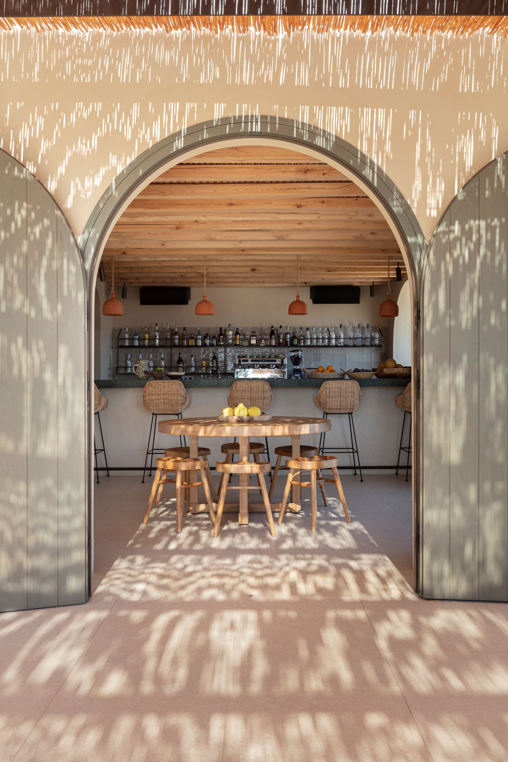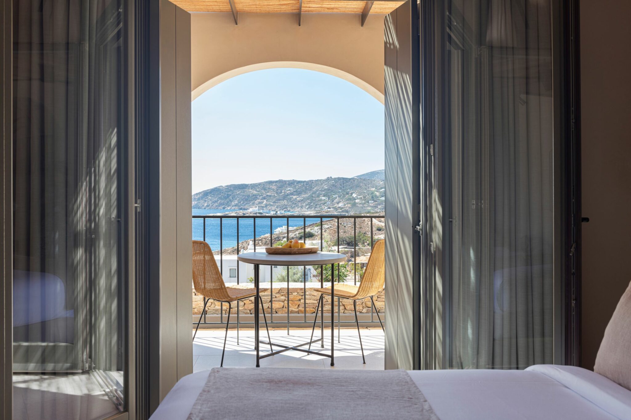 Ο πρόλογος της ιδιωτικής αυλής με την έκπληξη του υγρού στοιχείου θα σε προετοιμάσει με τον πιο ευχάριστο τρόπο για τη σουίτα σου που ακολουθεί αμέσως μετά. Εδώ οι γεωμετρίες και το φως μαλακώνουν με τις καμάρες και τους θολωτούς διαδρόμους να δημιουργούν το κουκούλι της ιδιωτικότητάς σου. Η γήινη χρωματική παλέτα, τα φυσικά, καθαρά και απτά υλικά -η πέτρα, το μάρμαρο, η κουρασάνη- συμπυκνώνουν σε μόλις λίγα τετραγωνικά όλη την μοναδικότητα αυτού του κομματιού κυκλαδίτικης γης και των παράγωγων της. Οι κεραμικοί νιπτήρες, αλλά και αντικείμενα, όπως τα σαν πλεκτά καλάθια σκαμπό, υμνούν τη δεξιοτεχνία των Σιφναίων τεχνητών την ίδια ώρα που τα Coco-mat στρώματα, τα ηχεία Μarshall, οι καφετιέρες Nespresso και οι tote bags με τις πετσέτες θαλάσσης λειτουργούν ως υλικές αναφορές της σύγχρονης ευζωίας.