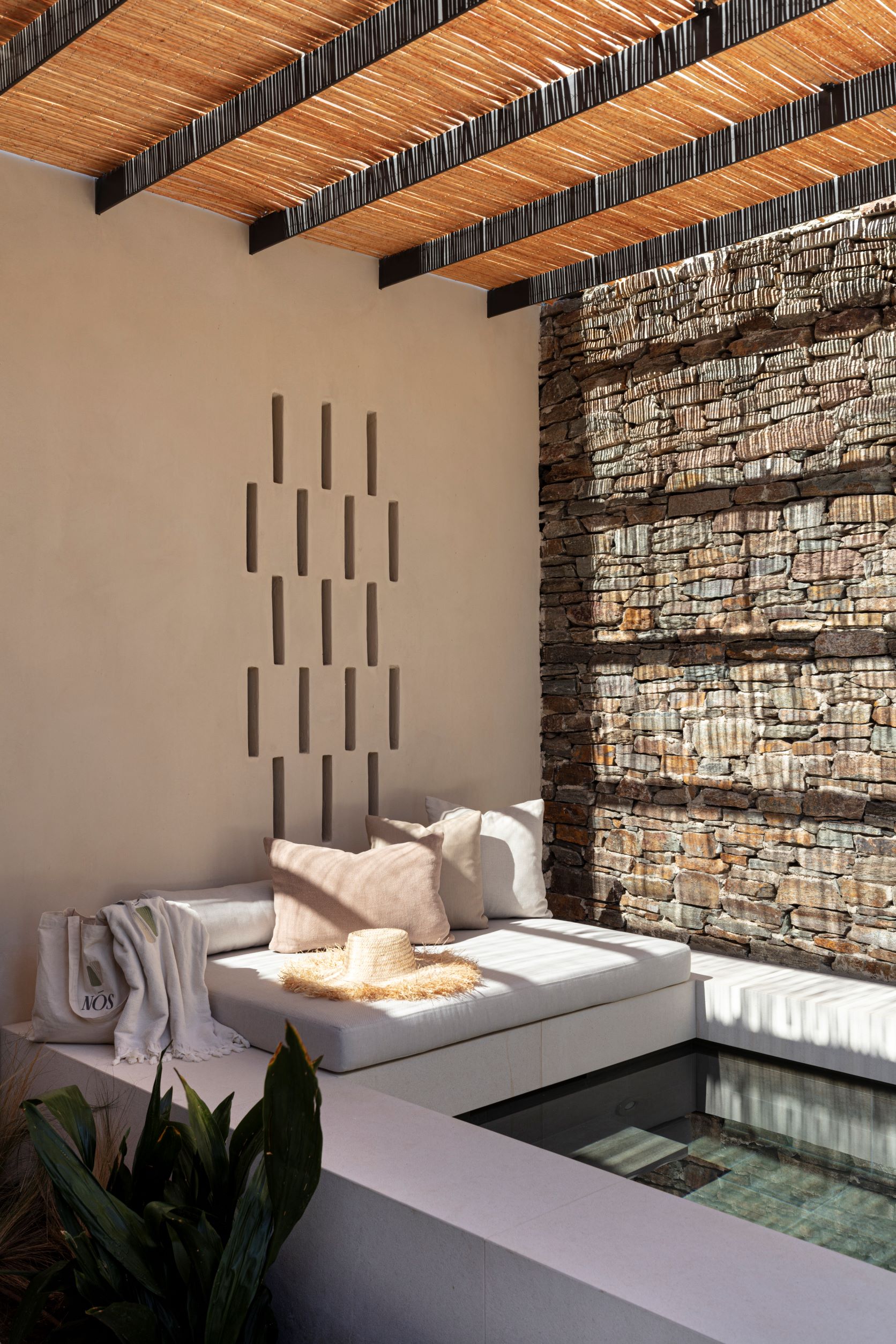 «Στο NOS προσπαθήσαμε να φέρουμε τις ποιοτικές της σύνθεσης ενός χωριού. Με τους ενδιάμεσους χώρους, τα καλντερίμια, τις αυλές, αλλά και την πλατεία του χωριού να “αναπαρίσταται” στο άνοιγμα γύρω από το εστιατόριο και την πισίνα» αναφέρει χαρακτηριστικά ο Δημήτρης Καραμπατάκης.