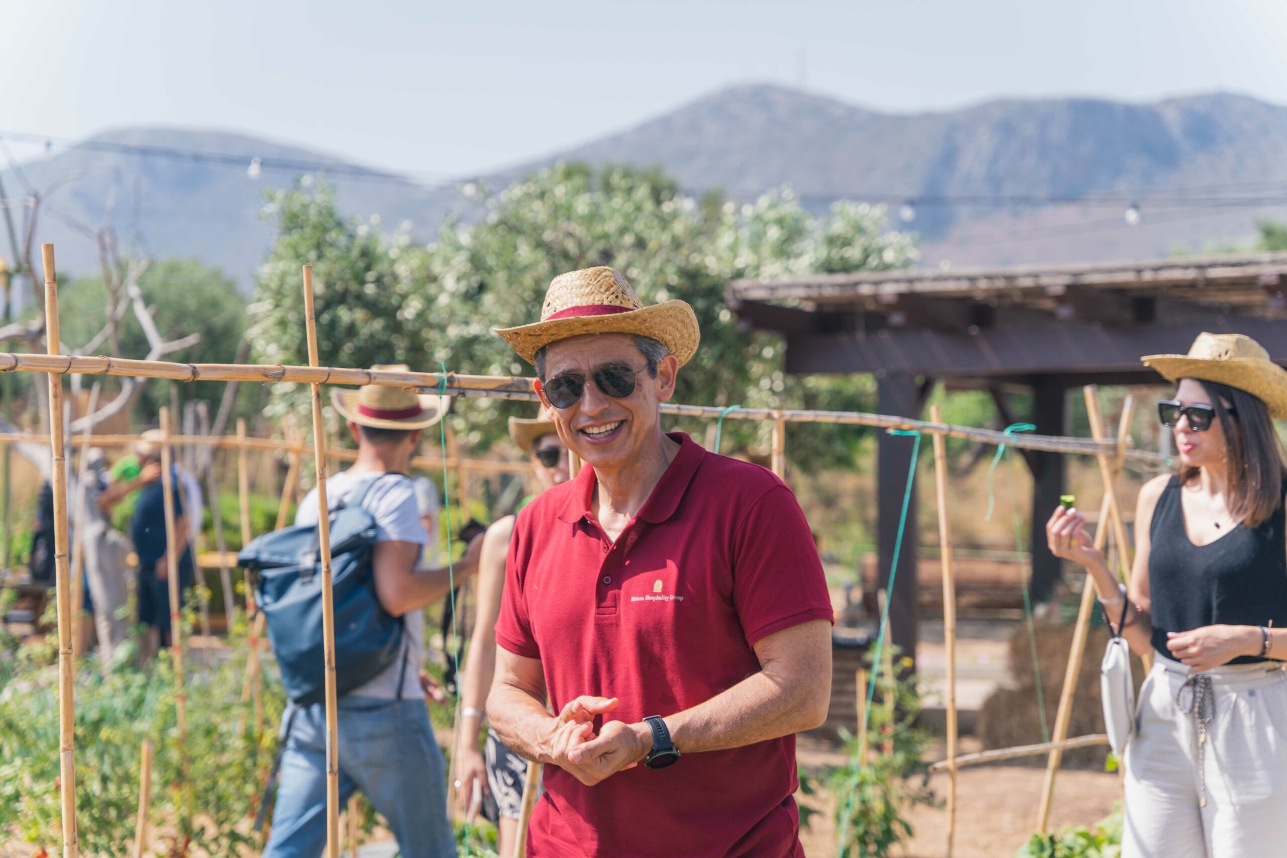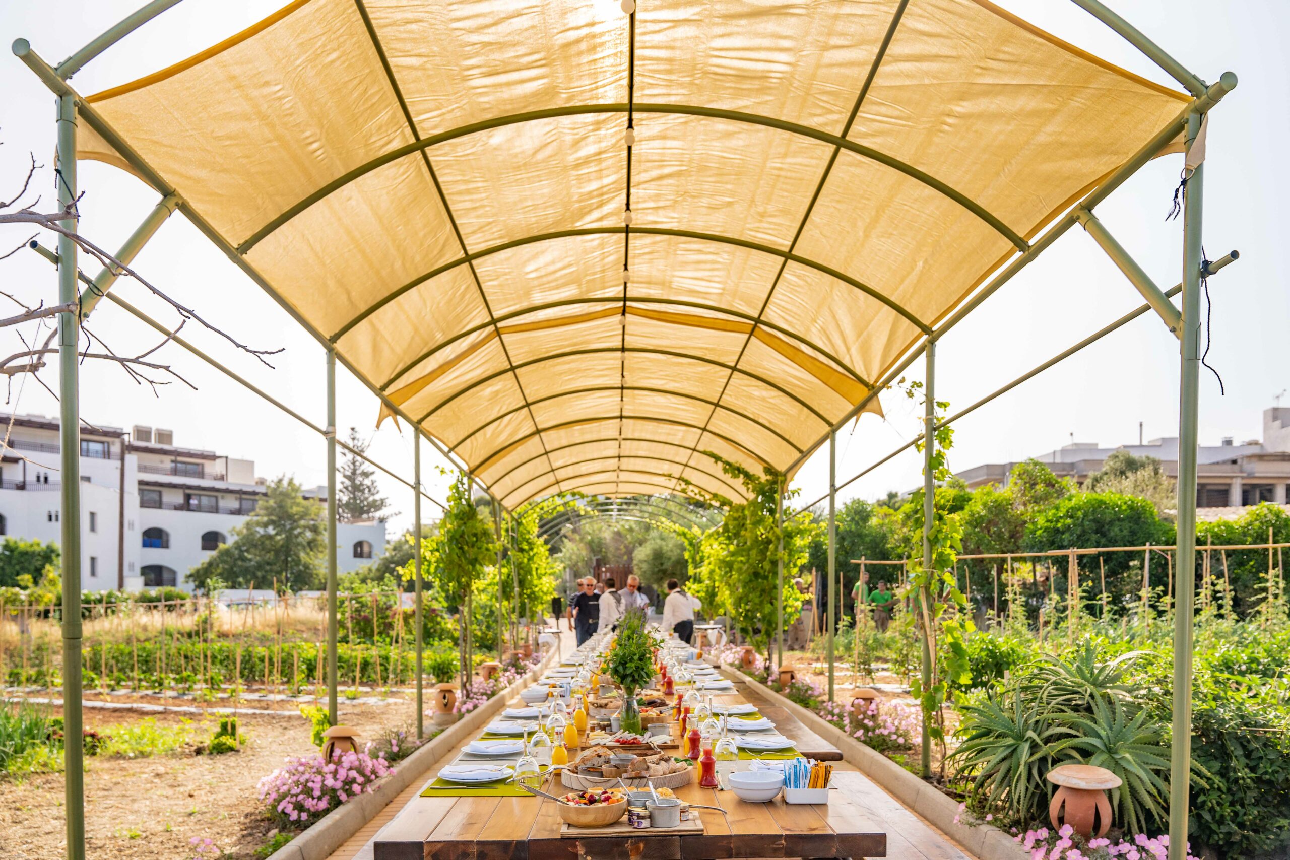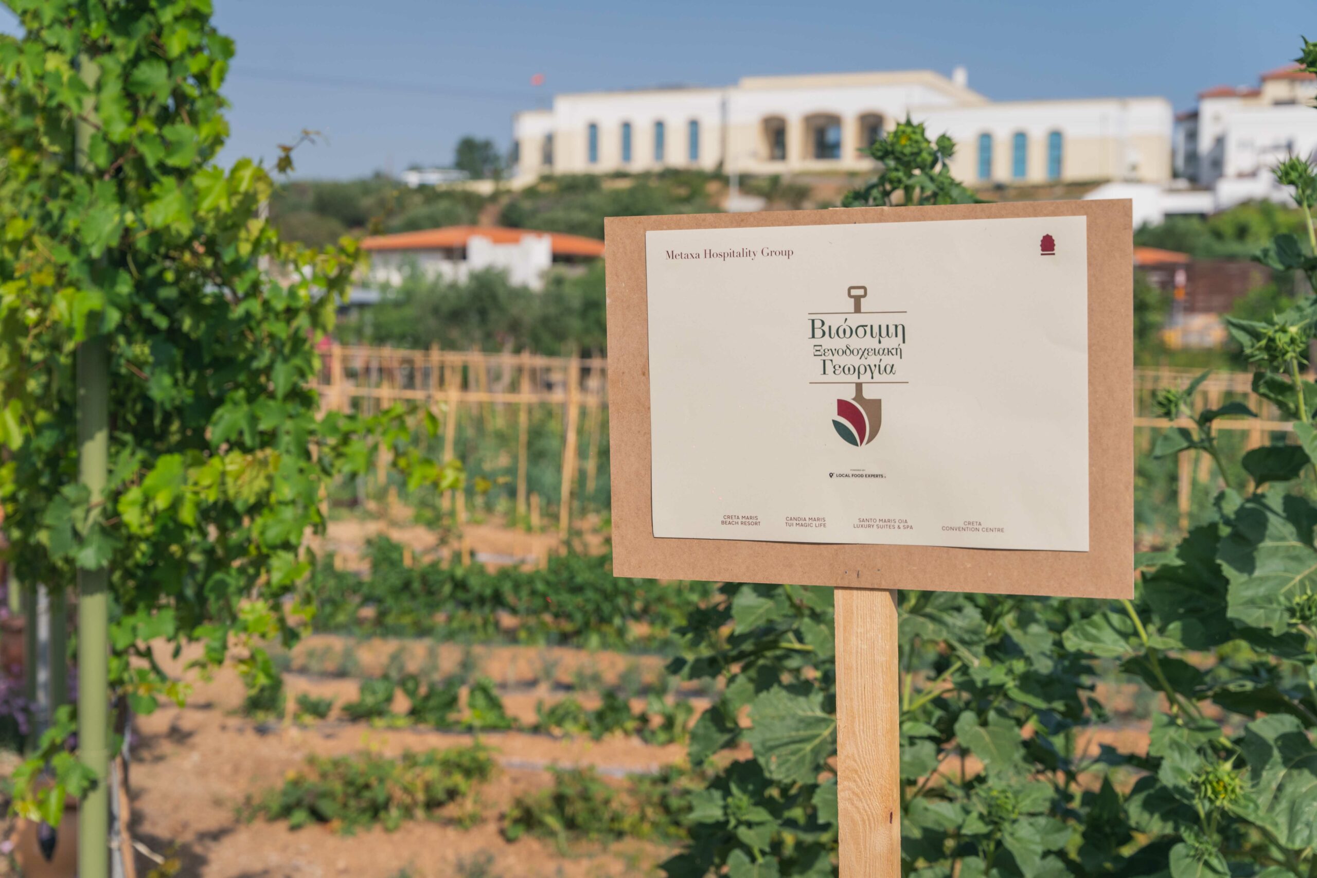 Για παράδειγμα, στις εκτάσεις του ξενοδοχείου υπάρχουν κήποι που καλλιεργούνται με βιώσιμες πρακτικές τα βιολογικά φρούτα, οι ξηροί καρποί και τα λαχανικά, χωρίς καμία χρήση ζιζανιοκτόνων ή φυτοφαρμάκων. Επίσης, η χρήση του νερού γίνεται με μέτρο και η καλλιέργεια βάση εποχικότητας. Μία πολύ ενδιαφέρουσα τεχνική καλλιέργειας που ακολουθείται λέγεται “τεμπέλικα κρεβάτια” και την ακολουθούσαν τόσο οι Μινωίτες όσο και οι Ίνκας (!) για να αυξήσουν την παραγωγή της τροφής τους.