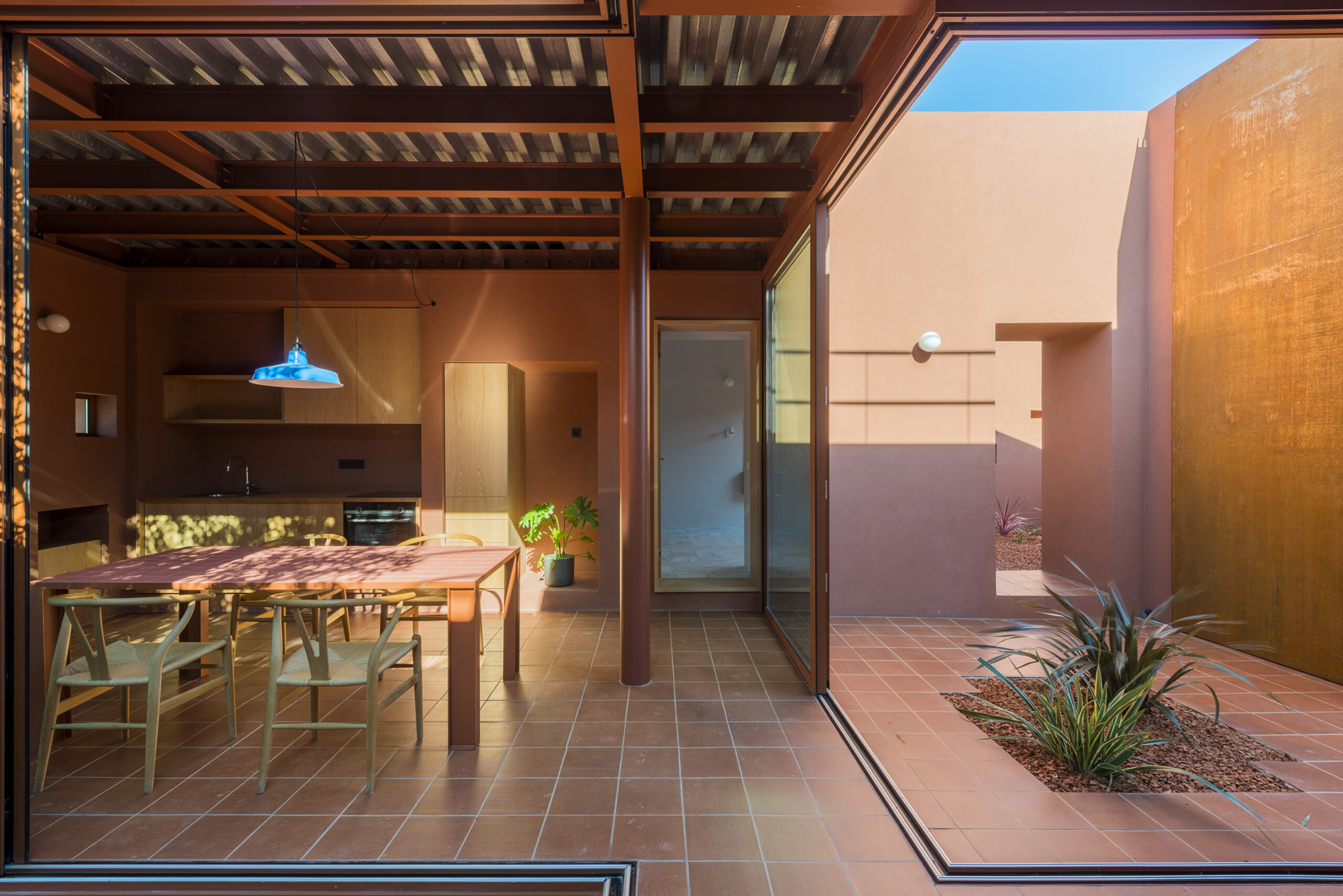 Μέσα στην αυλή τέσσερα ζεύγη συρόμενων υαλοστασίων μοιράζουν το χώρο στα τέσσερα: δύο κλειστά και δύο υπαίθρια δωμάτια στεγάζουν τους κύριους χώρους διημέρευσης και αφήνουν μία μικρότερη αυλή εισόδου και μία μεγαλύτερη με την ελιά. Καθώς τα υαλοστάσια μετακινούνται, η εξωτερική σταθερότητα του μονολιθικού κτίσματος ανατρέπεται και η ισορροπία μεταξύ κλειστού και υπαίθριου αλλάζει» σημειώνουν χαρακτηριστικά οι αρχιτέκτονες.
