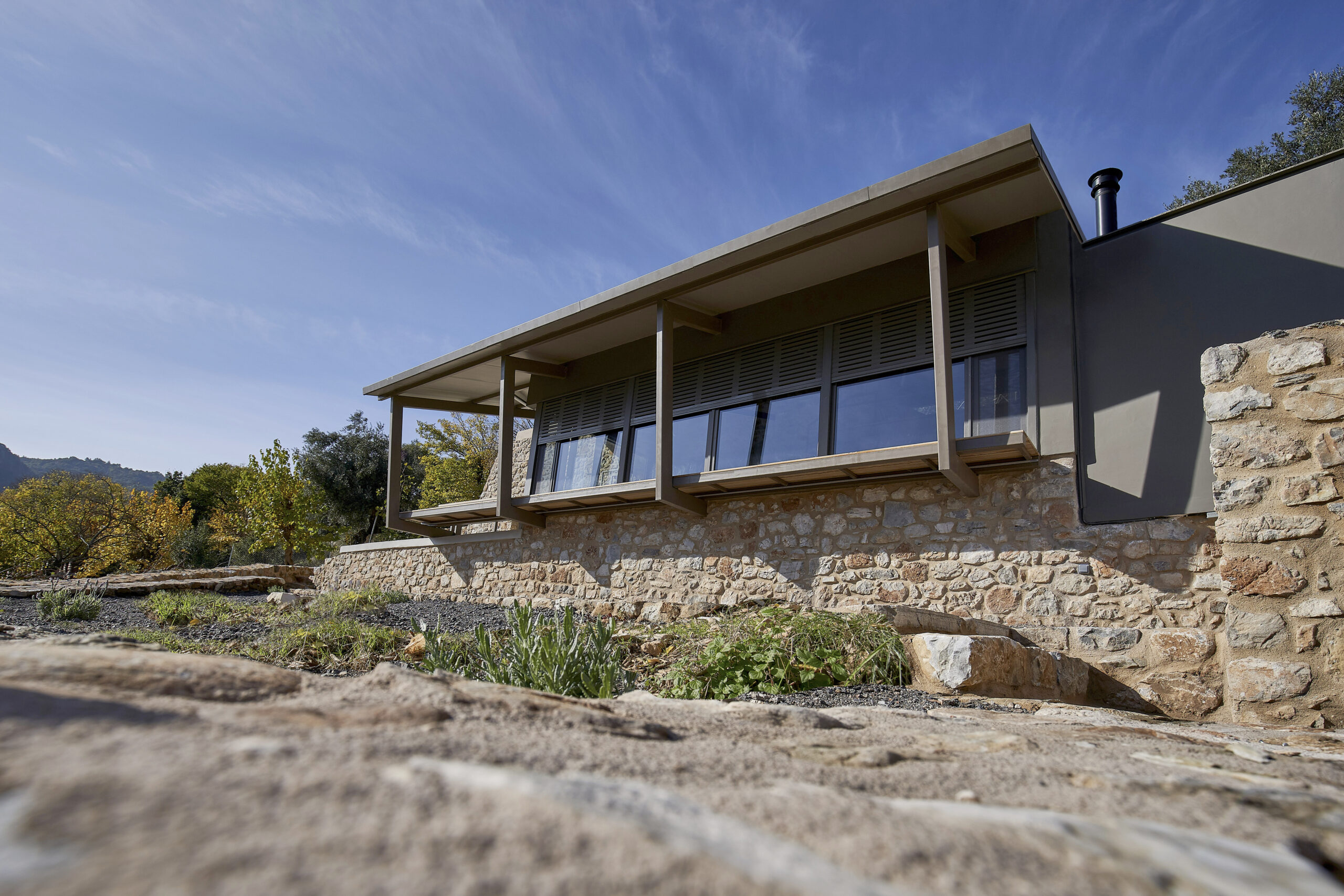 «Ο επιμήκης χώρος διημέρευσης της κατοικίας τοποθετείται στη νοτιοδυτική πλευρά της κεντρικής εισόδου, κάθετα ως προς το φαράγγι. Η νοτιοανατολική όψη είναι διαμπερής και έχει θέα προς την κατωφέρεια, στην χαράδρα και τα βουνά που την πλαισιώνουν. Η ενιαία γυάλινη επιφάνεια προσφέρει φως και ζέστη στο εσωτερικό του σπιτιού κατά τους χειμερινούς μήνες, καθώς οι ώρες ηλιοφάνειας είναι λιγοστές και το δειλινό πέφτει νωρίς κάτω απο τη βαριά σκιά του Ταΰγετου. Η βορειοδυτική όψη είναι συμπαγής πέτρινη και σχηματίζει μια ενιαία χαμηλή μάντρα προς τον δρόμο, έχοντας πίσω της τον ορεινό όγκο. Πάνω της στηρίζονται τα μεταλλικά πλαίσια που φέρουν μονόριχτη στέγη. Χρησιμοποιώντας σαν αναφορά τα παραδοσιακά “κρεμαστά” μπαλκόνια, τα πλαίσια καταλήγουν σε επικλινείς μεταλλικές κολόνες που στηρίζουν τον επιμήκη εξώστη που περνάει και στο εσωτερικό του σπιτιού» περιγράφει η αρχιτέκτονας Έλενα Ζερβουδάκη.