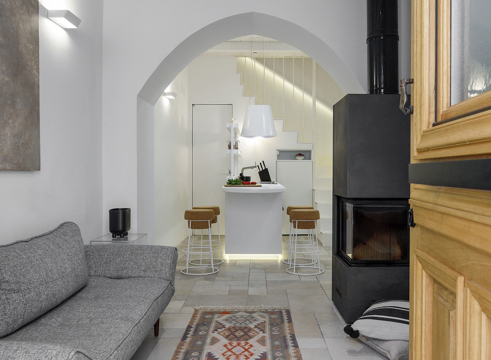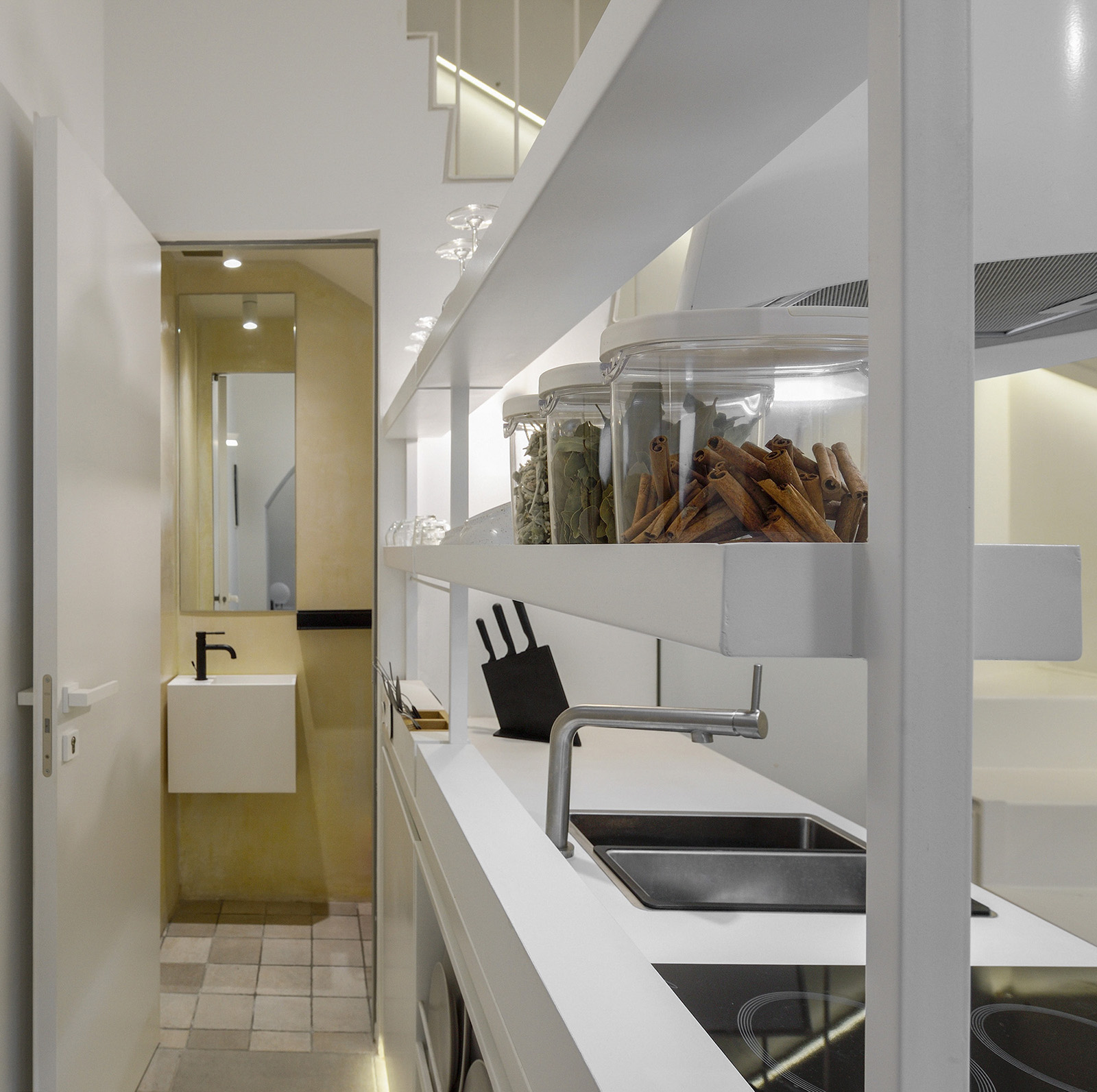 Επιπρόσθετα, εγκαταστάθηκε ένας ηλιακός φωτοσωλήνας που διοχετεύει το φως της ημέρας απευθείας από τη βεράντα στην κουζίνα, αυξάνοντας περαιτέρω τα επίπεδα του φυσικού φωτισμού στο εσωτερικό. Αυτές οι δύο τολμηρές χειρονομίες, σε συνδυασμό με το λευκό χρώμα των τοίχων, της οροφής και των επίπλων, επιτρέπουν στο φυσικό φως να διεισδύσει σε κάθε όροφο, δίνοντας ροή και κίνηση στους χώρους διαβίωσης. Έτσι το ΜΙΚΙΟ, πήρε φως άρα και ζωή!