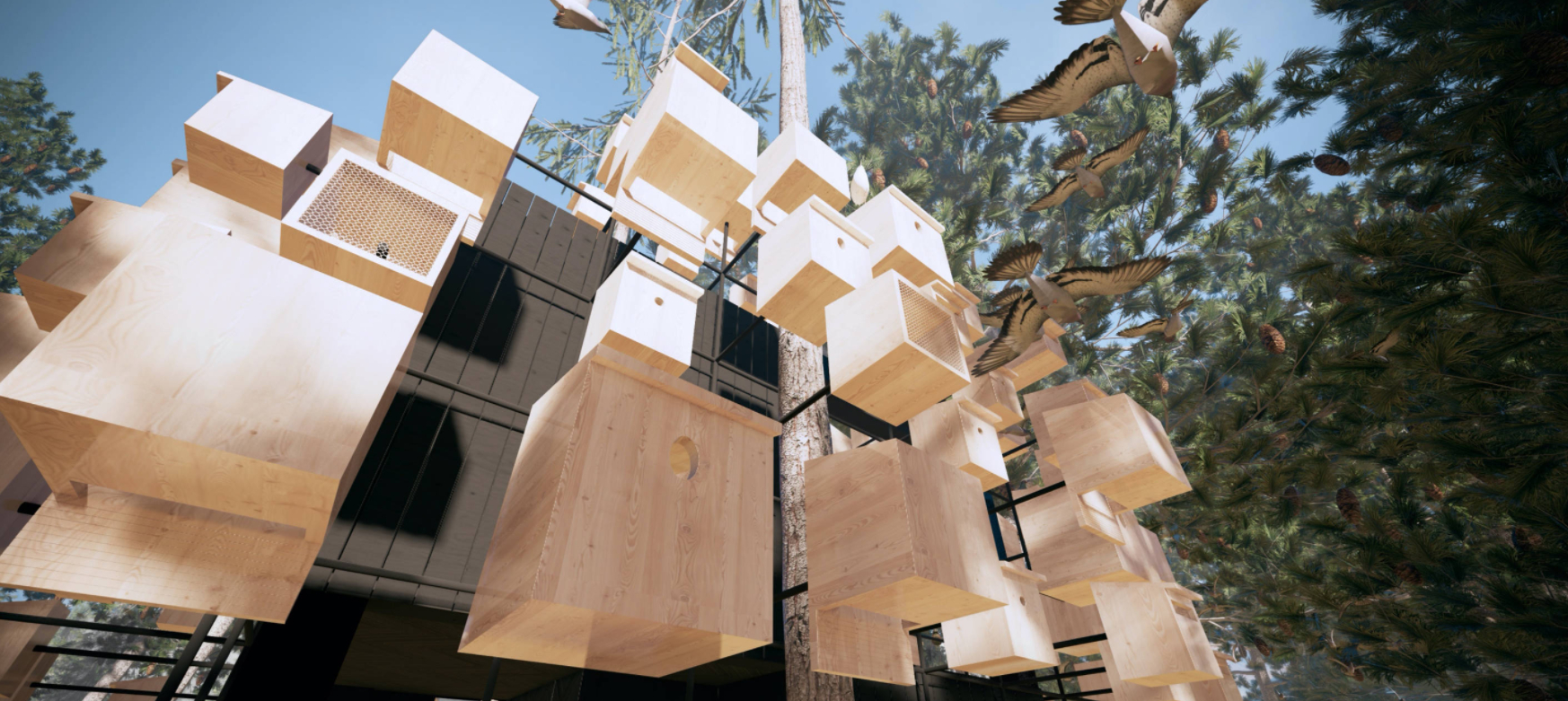 Το γυάλινο αρχιτεκτονικό θαύμα, που αναμένεται να ανοίξει για τους τουρίστες τον προσεχή Μάϊο, είναι ουσιαστικά ένα εξελιγμένο, σφαιρικό δεντρόσπιτο που κρέμεται σαν υπερφυσική μπάλα ανάμεσα στα πεύκα και περιβάλλεται από 340 ξύλινα σπιτάκια πτηνών, προσφέροντας στους επισκέπτες ένα απολαυστικό ξύπνημα την αυγή, με τη μουσική από εκατοντάδες τιτιβίσματα πτηνών.