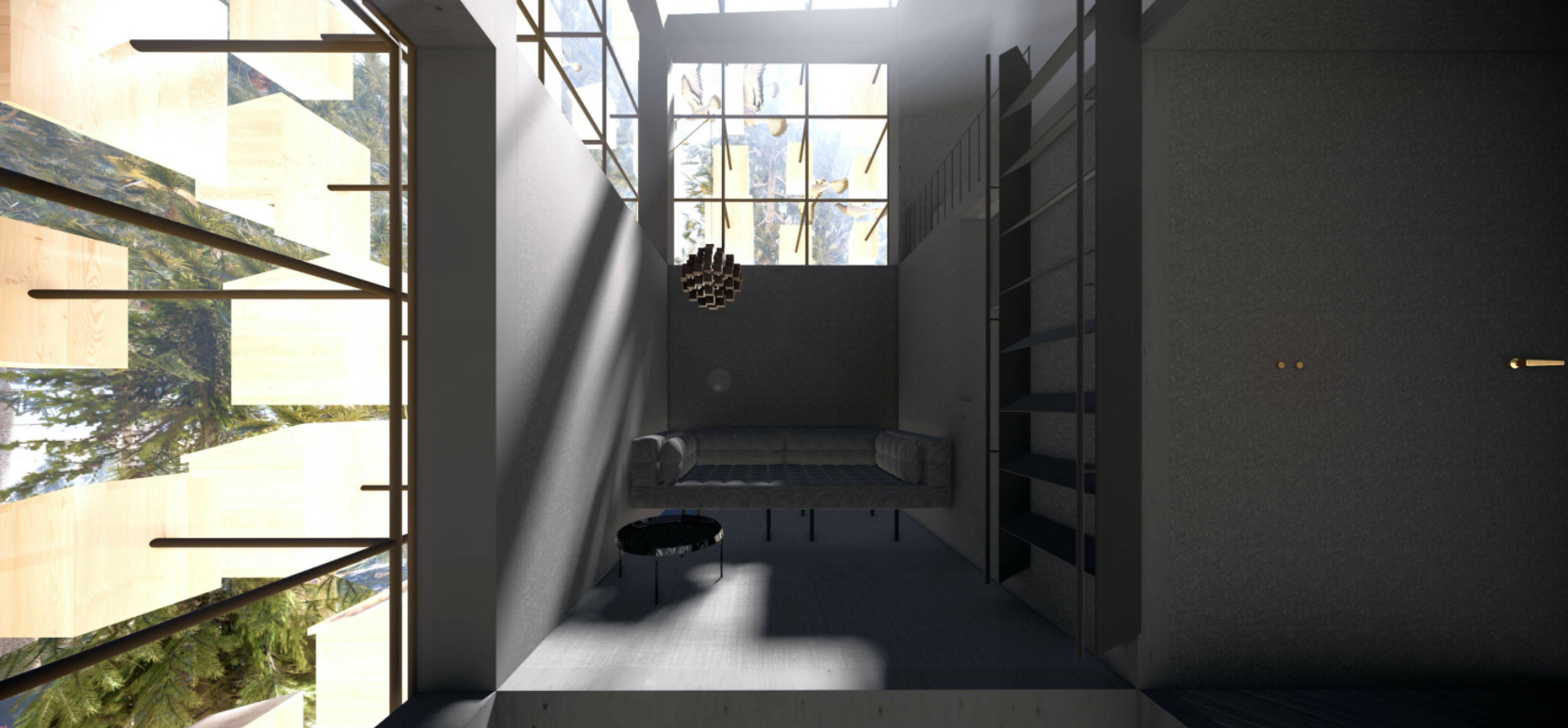 Το εσωτερικό της, κατάλληλο για δύο άτομα, συντίθεται από πλούσιους σκοτεινούς χώρους και οργανικά υλικά εμπνευσμένα από το γύρω τοπίο, που χρησιμεύουν περαιτέρω στην ενίσχυση της θέας και στην ανάδειξη της φυσικής ομορφιάς του περιβάλλοντος χώρου. Επιπλέον, οι επισκέπτες της μπορούν να απολαύσουν όλες τις σύγχρονες ανέσεις, όπως είναι η σάουνα, αλλά και την ομορφιά του δάσους από την ονειρική βεράντα της.