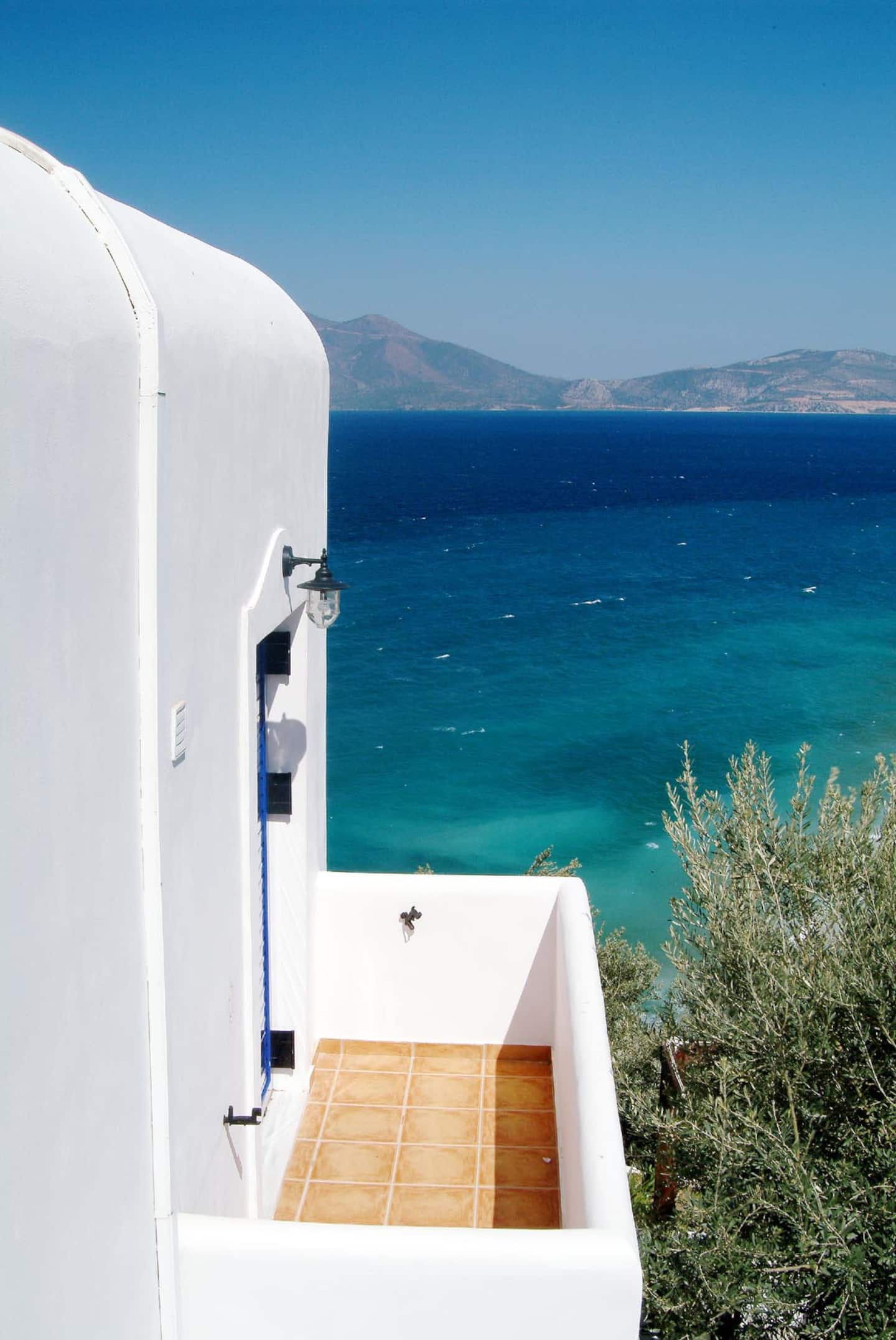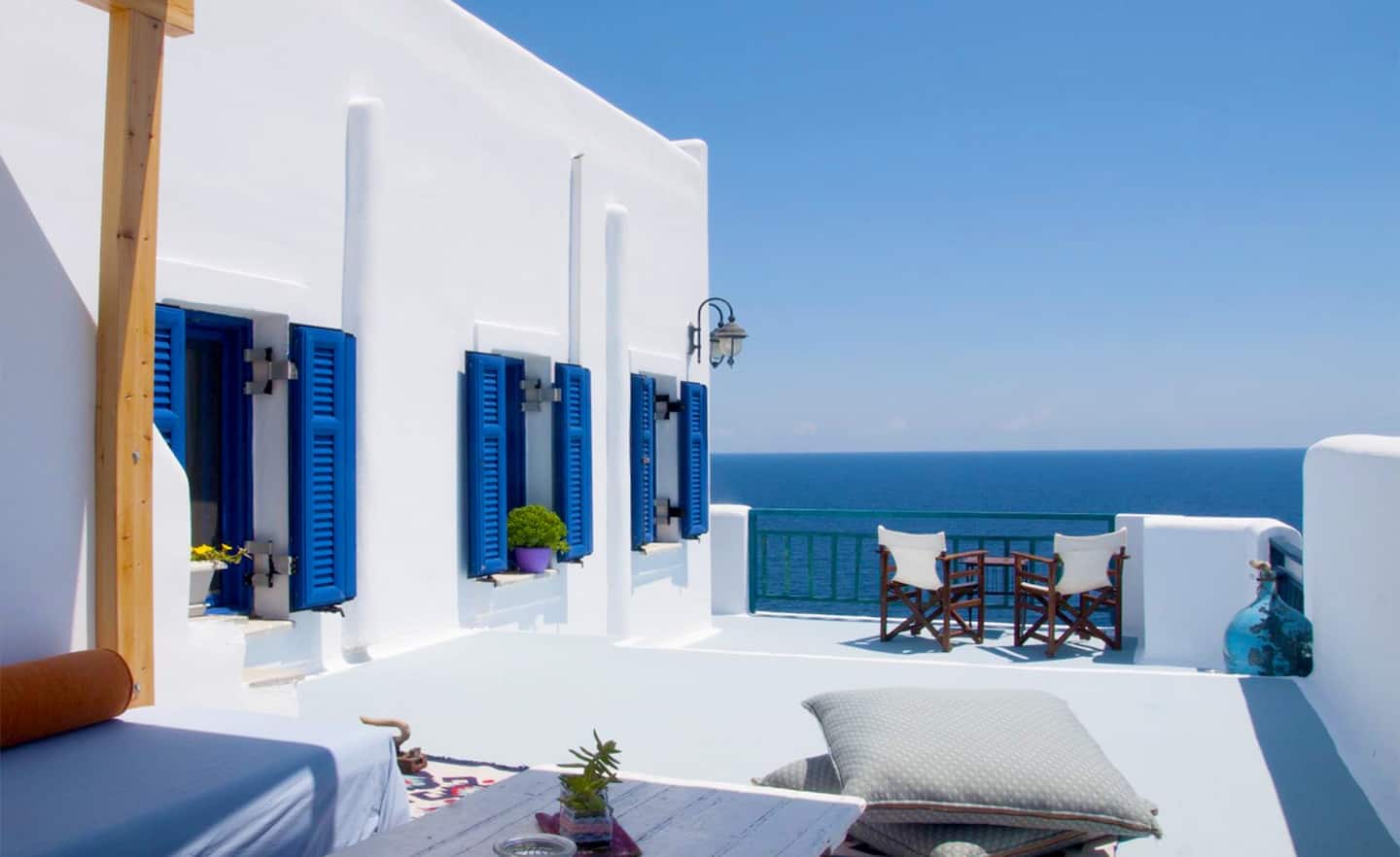 Κυκλαδίτικη ομορφιά στην Εύβοια; Σε αυτό το κατάλευκο σπίτι με τα μπλε παράθυρα και τη βεράντα που βλέπει το απέραντο γαλάζιο, ναι.