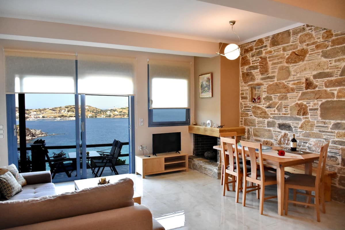 Στο σπίτι κυριαρχεί η πέτρα τόσο μέσα όσο και έξω, αλλά και το μπλε του Αιγαίου. Το σαλόνι του είναι πολύ φωτεινό, ενώ στο μεγάλο μπαλκόνι θα πάρετε ανάσες οξυγόνου. Έχει ιδιωτική είσοδο και θεωρείται ασφαλές για τους μικρούς επισκέπτες του.