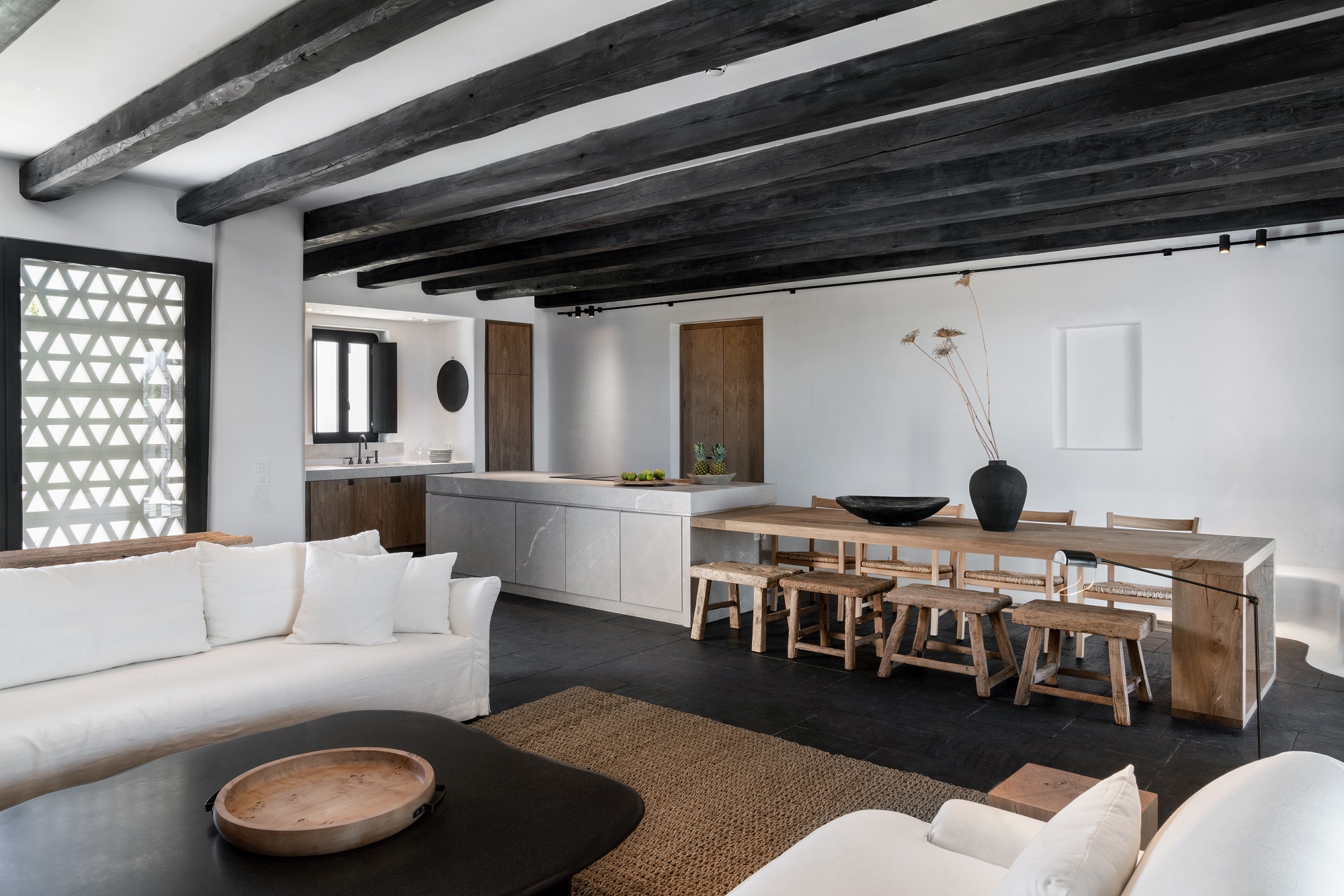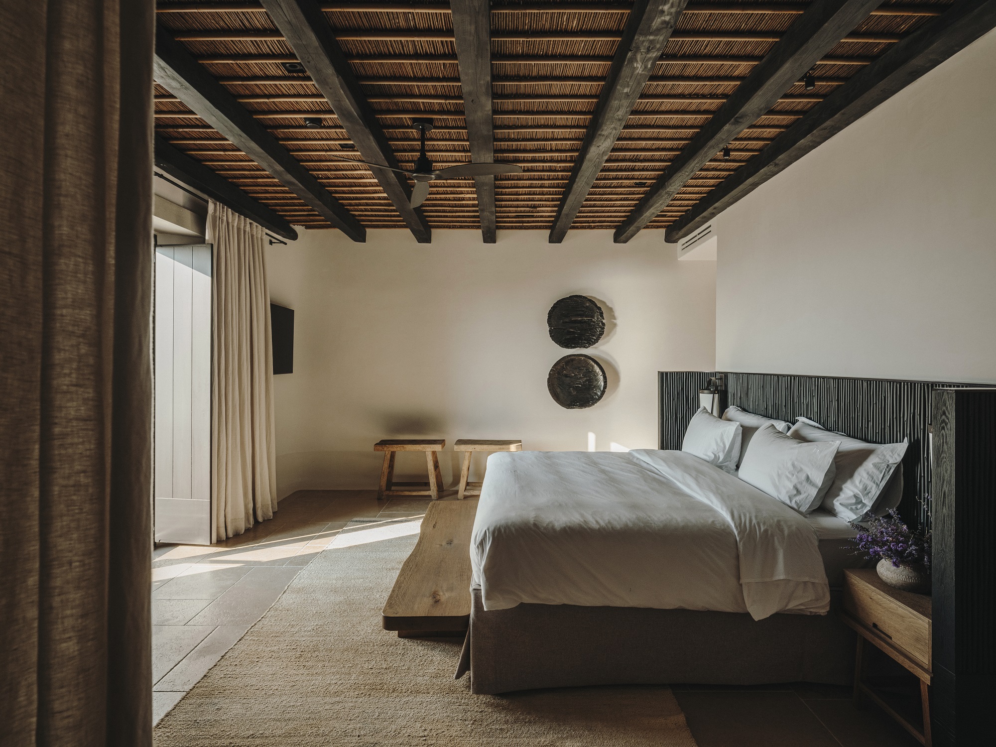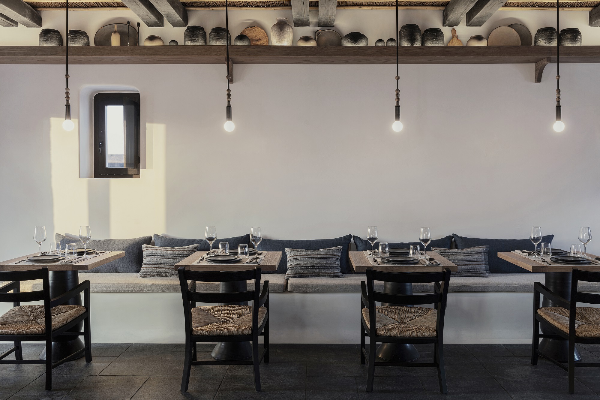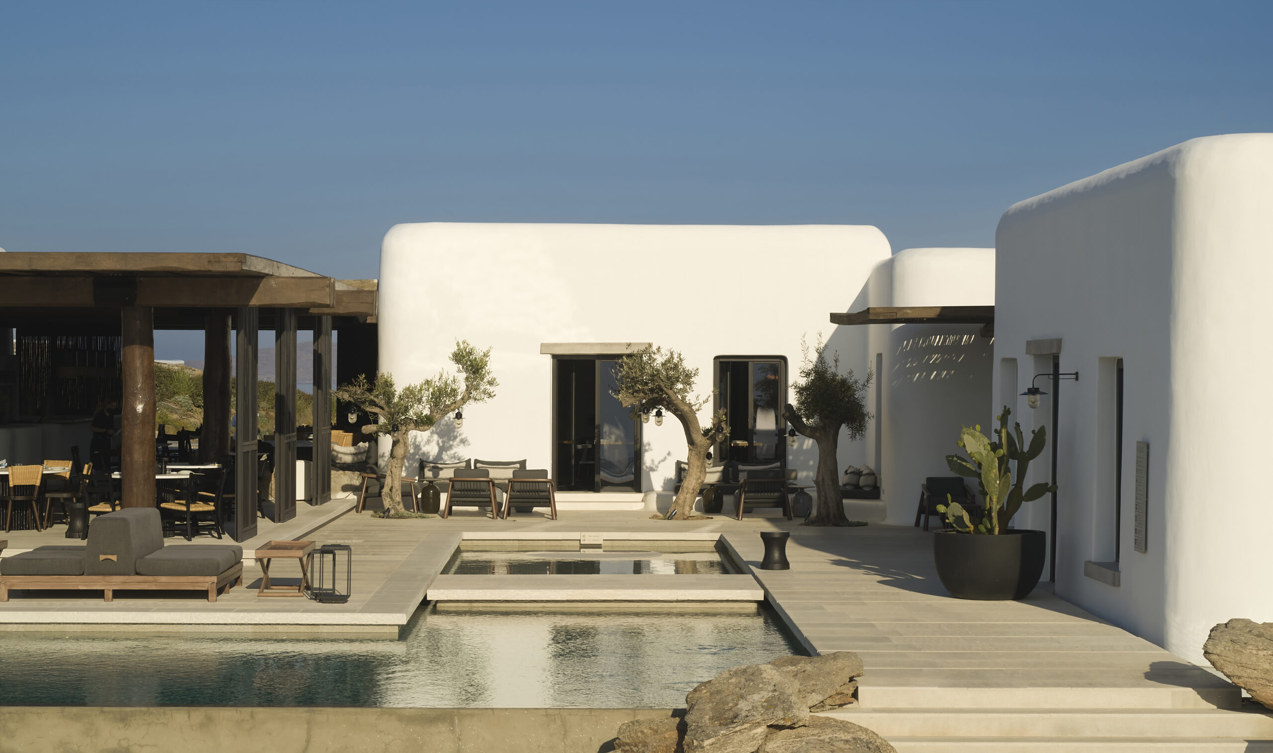 «Oι μπρούτζοι, οι πέτρες είναι δουλεμένα από τεχνίτες σε συνεργασία με το Studio Bonarchi και το υλικό δημιουργεί ένα καθεστώς αλήθειας για το όλο εγχείρημα, την οποία νιώθει ο επισκέπτης», λέει ο Βαγγέλης Μπόνιος. «Εγώ τόλμησα κι έβαλα πρώτη φορά σκούρες αποχρώσεις στο λόμπι και στις οροφές. Η ένταση του σκούρου αναδεικνύει το λευκό. Γιορτάζει το ελληνικό φως, στην ουσία. Και πιστεύω το πιο καίριο δεδομένο που έρχεται να βιώσει κάποιος στην Ελλάδα είναι το φως. Οπότε η σκέψη μου γι’ αυτό ήταν πάρα πολύ συγκεκριμένη. Στο λόμπι μπαίνεις από την πίσω πλευρά και φτάνεις σε μια αυλή, όπου λούζεσαι από το εντυπωσιακό ελληνικό φως. Ήθελα επίσης να δώσω μια διαφορετική απάντηση στον boho κατακρημνισμό της αισθητικής των νησιών του Αιγαίου. Δεν θεωρώ ότι μας τιμά σαν Έλληνες να γεμίσουμε με καλάθια που έχουν έρθει από το Μεξικό. Δεν ήθελα να κρεμάσω άλλο καλάθι, ως τάχα μου εξέλιξη».