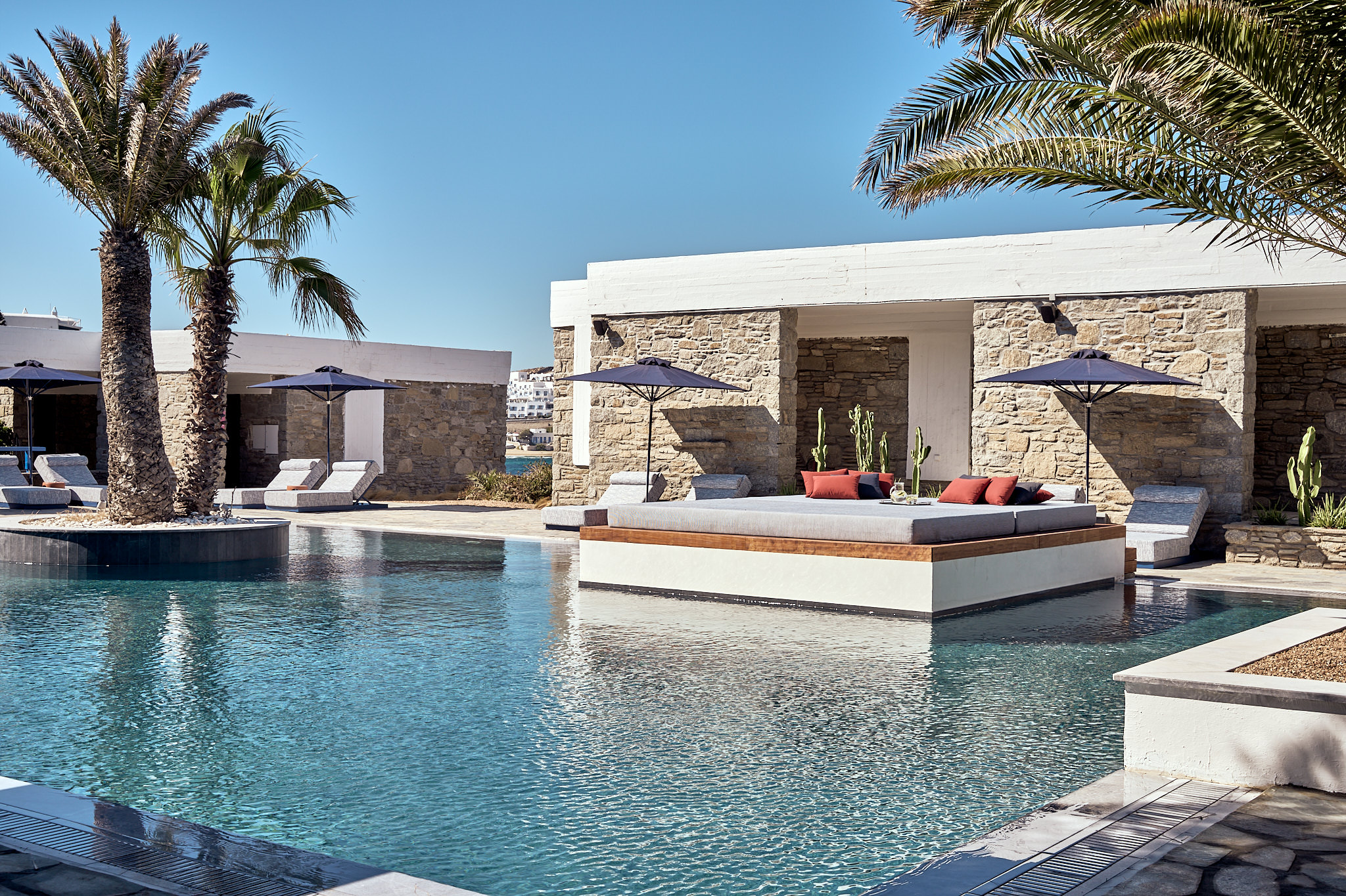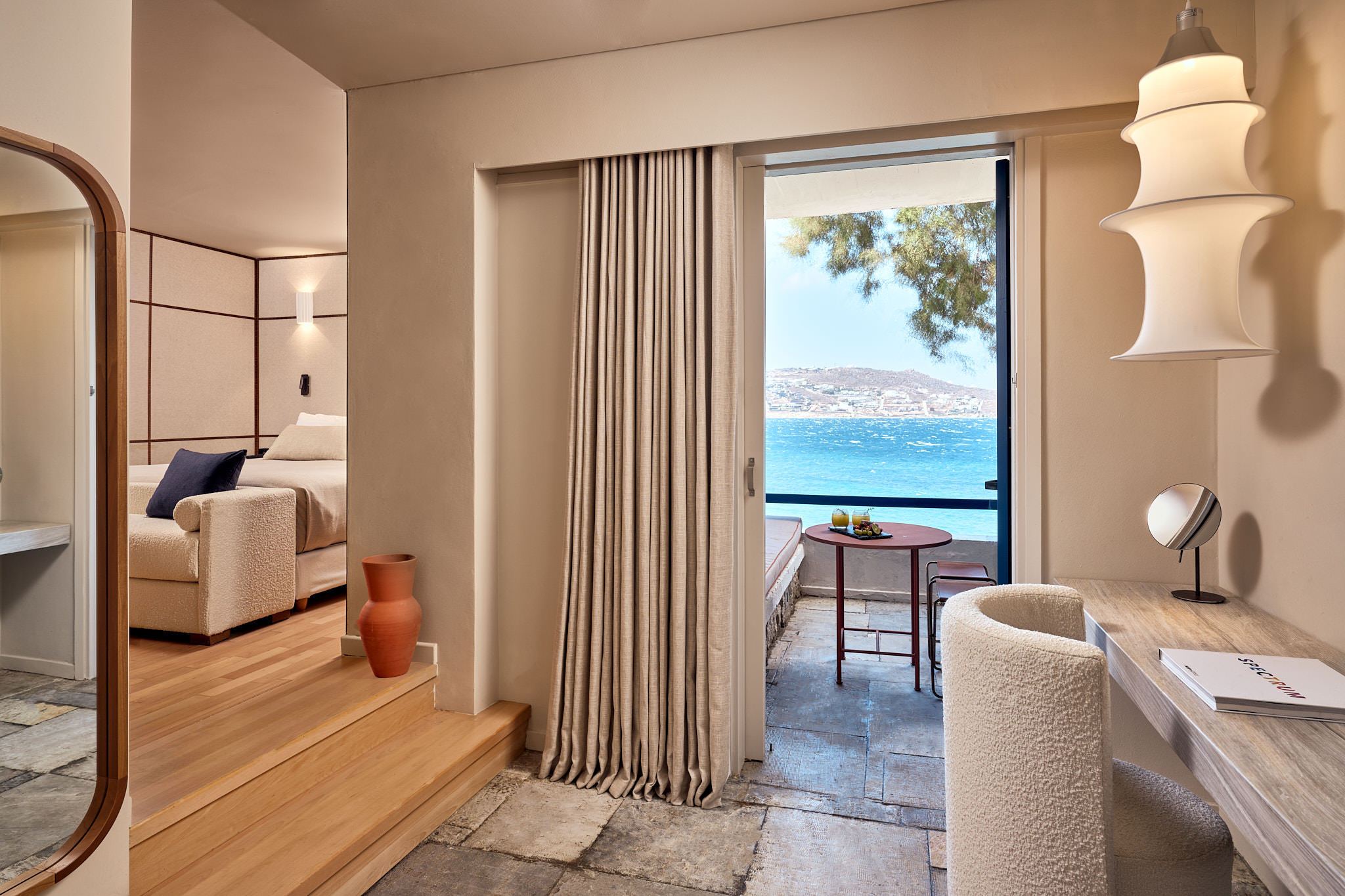 Από την εμβληματική αρχιτεκτονική του μέχρι και την πιο μικρή λεπτομέρεια, το Mykonos Theoxenia προσκαλεί τον επισκέπτη να βιώσει τη «φιλοξενία των θεών», ανακαλύπτοντας την πεμπτουσία και την υποβλητική απλότητα του ελληνικού καλοκαιριού. Από τα χρώματα του ξενοδοχείου που έρχονται σε τέλεια αρμονία με το φυσικό τοπίο, τα απαλά κλινοσκεπάσματα και τις οργανικές λινές υφές μέχρι τις γλυπτικές φόρμες του κτιρίου, όλα εδώ συνηγορούν στη δημιουργία μιας μοναδικής ατμόσφαιρας, φιλόξενης και συνάμα διακριτικά πολυτελούς.