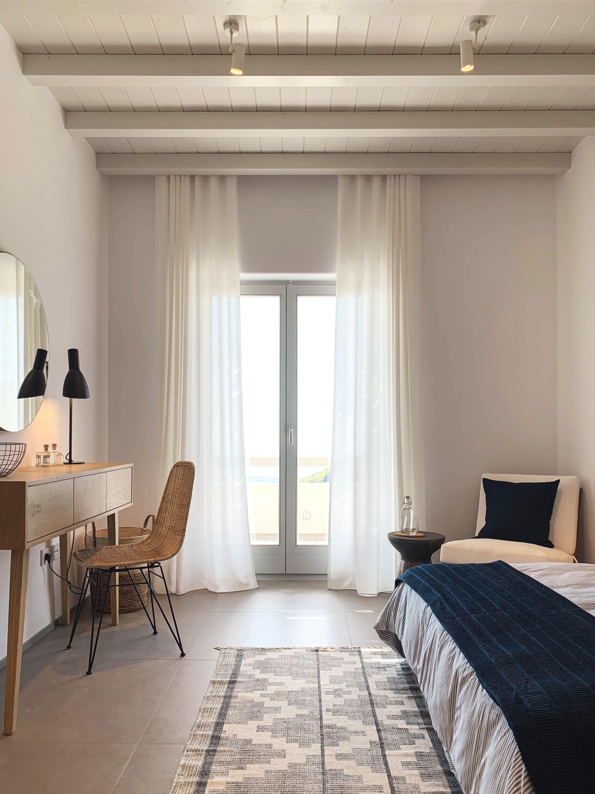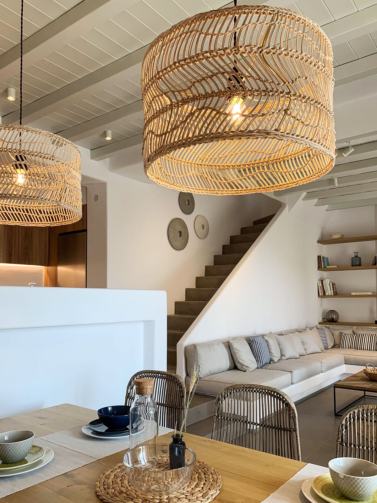 Ξύλο, ψάθα και ρατάν φέρνουν ένα κομμάτι εξοχής σε σαλόνι, τραπεζαρία και κρεβατοκάμαρα. Μπάνιο και κουζίνα, αρχόντισσες της λειτουργικότητας. Ό,τι χρειάζεται κάποιος για να ζήσει εκεί για πάντα με ένα διαρκές αίσθημα ευφορίας. Ο ευρύχωρος καναπές, το μίνιμαλ coffee table, η βιβλιοθήκη, τα bold φωτιστικά, o μεγάλος στρογγυλός καθρέπτης. Ό,τι πιο σύγχρονο στο interior design.