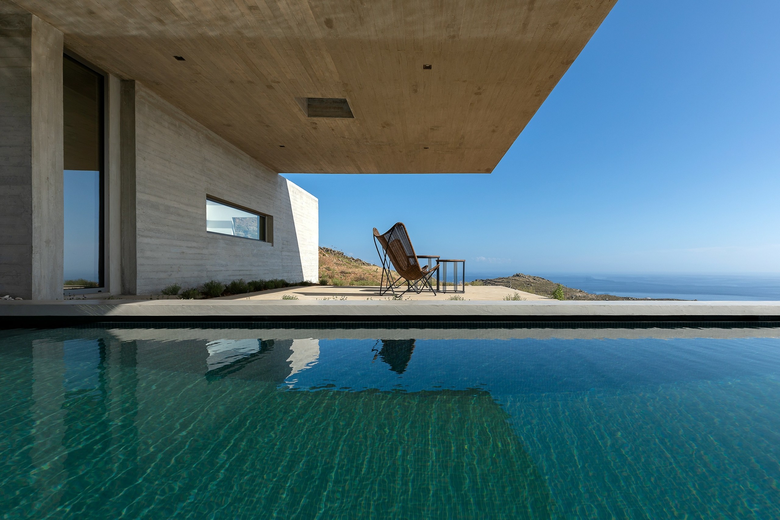 Όλη η δυναμική του κτιρίου υπογραμμίζεται με τον γραμμικό όγκο της πισίνας που προεξέχει από την πλαγιά και κατευθύνει το βλέμμα στον ορίζοντα» σημειώνουν χαρακτηριστικά οι αρχιτέκτονες που ανέλαβαν το project.