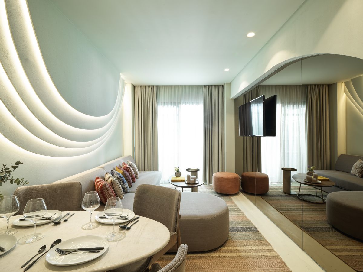 Στο ξενοδοχείο θα λειτουργούν εστιατόρια παραδοσιακής αλλά και μοντέρνας γαστρονομίας, σούσι, χώροι αναψυχής, πισίνες, γυμναστήριο, μπαρ, παιδικό πάρκο και υποδομές για θαλάσσια σπορ. Η αρχιτεκτονική ομάδα της Elastic Architects αποκατέστησε το προϋπάρχον κτίριο και του έδωσε νέα ζωή, παίρνοντας έμπνευση από την ιστορία του τόπου, το υδάτινο και το γήινο στοιχείο. Μια σειρά από τεράστιες καμπυλωτές επιφάνειες στην εξωτερική πλευρά θυμίζουν τα βότσαλα της παραλίας, ενώ η χρωματική παλέτα του εσωτερικού του παραπέμπει στο τοπικό ηφαίστειο (Σουσάκι) που υπήρχε στην περιοχή πριν εκατομμύρια χρόνια. Επίσης, το ξενοδοχείο διαθέτει χώρο 550 τ.μ. για συνέδρια.