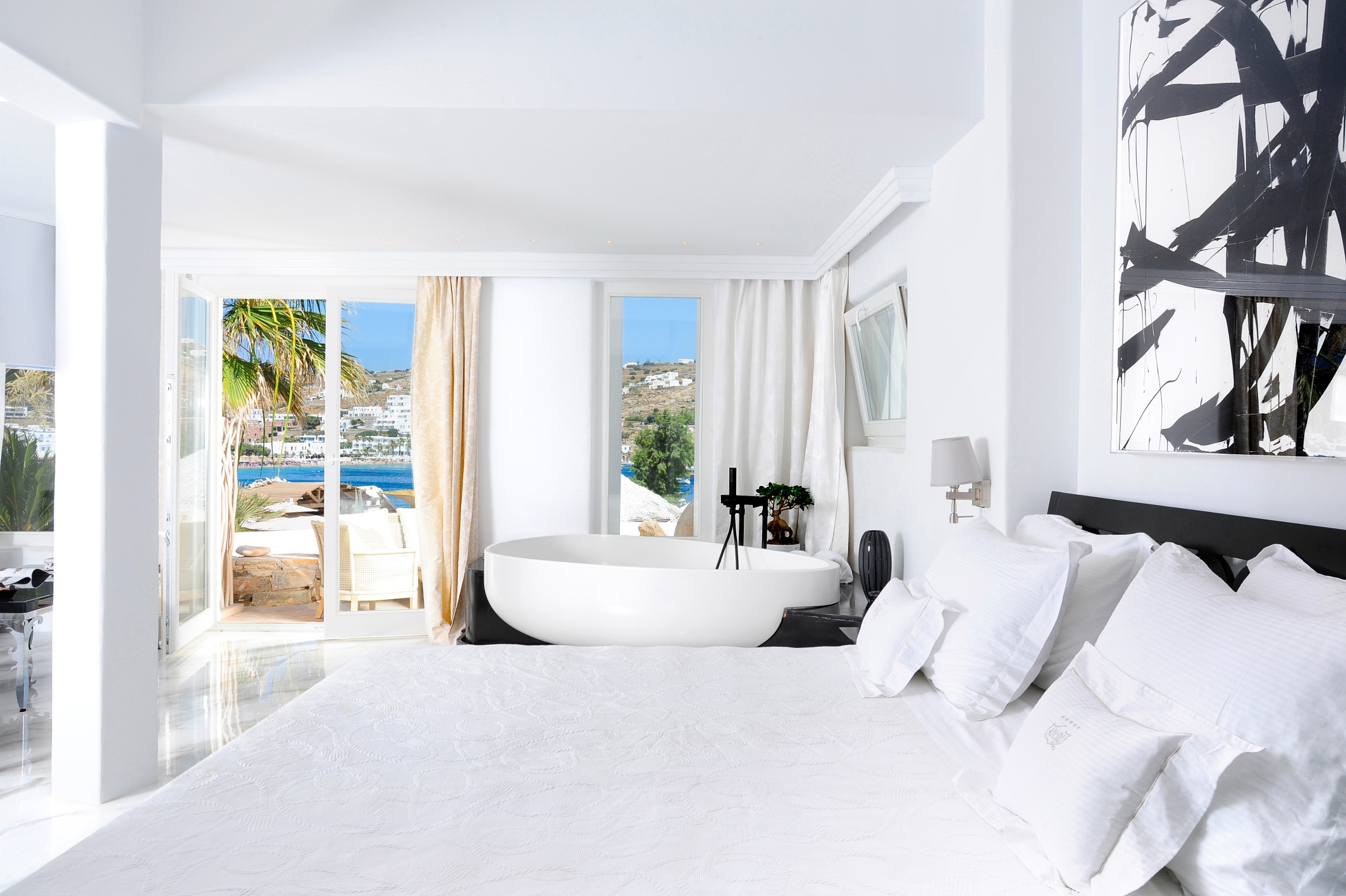 Θυμίζοντας μικρογραφία της Χώρας της Μυκόνου, οι 41 σουίτες του ξενοδοχείου είναι χτισμένες με μαεστρικό τρόπο ανάμεσα σε σοκάκια, κρυφές γωνίες, πλατείες και κομψές τεχνητές «λίμνες». Σε ένα από αυτά τα σημεία μπορεί κανείς να δει έκπληκτος τα αντίγραφα των λιονταριών της γειτονικής Δήλου, σκαλισμένα σε μάρμαρο Νάξου όπως και τα αυθεντικά. Κατά την περίοδο 2013-2015 το ξενοδοχείο φιλοξένησε έργα περισσότερων από 50 Ελλήνων μοντέρνων καλλιτεχνών στην art gallery που διαθέτει, τα δωμάτια και τους χώρους του, ως μέρος του Kivotos Art Projects. Νωρίτερα, το 2008, η οικογένεια Μιχόπουλου προχώρησε στην πρώτη μεγάλη ανακαίνιση του ξενοδοχείου προσθέτοντας για τους διαμένοντες την επιλογή του spa και της Noah Waterfront Villa, που παραμένει η μόνη βίλα στη Μύκονο με τη δική της παραλία. Είναι απολαυστικό να κατεβαίνεις λίγα σκαλιά από την κομψή «ιδιωτική» σου πισίνα και να βρίσκεσαι στη «δική σου» παραλία.