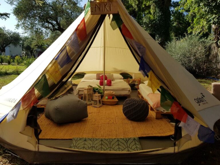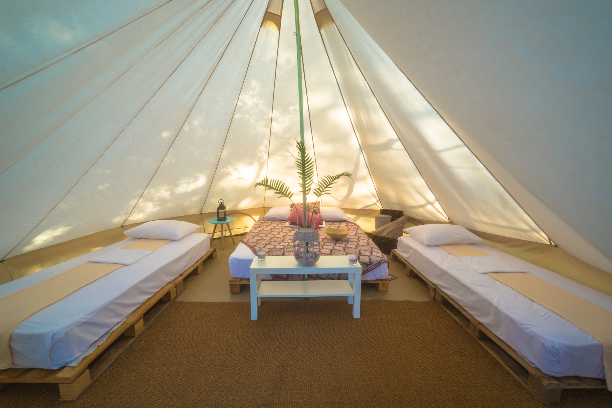 Αφού επιλέξετε τον τύπο διαμονής σας από μία αρκετά μεγάλη λίστα διαφορετικών καταλυμάτων θα απολαύσετε μοναδικές διακοπές στη φύση, όπως δεν γίνεται να τις ζήσετε μένοντας σε ένα τυπικό ξενοδοχείο. Οι λάτρεις της λιτότητας μπορούν να επιλέξουν ένα bungalow, τα χαριτωμένα, μικρά σπιτάκια που θυμίζουν καλυβάκια σε αφρικανικό χωριό. Ενώ αν θέλετε μία αληθινά διαφορετική εμπειρία κάντε κράτηση στο υπέροχο δεντρόσπιτο (για 2 ή για 4 άτομα) και απολαύστε το πρωινό ξύπνημα με αξέχαστη θέα. Ωστόσο, το camping δίχως σκηνές δεν θα ήταν ποτέ το ίδιο, για αυτό αν αναζητάτε κάτι πιο κοντά στη γνωστή, παραδοσιακή εμπειρία κάντε κράτηση για μία σκηνή «πολυτελείας» όπου θα βρείτε διαθέσιμα ξύλινα κρεβάτια, καρέκλες, βολικά πουφ με έθνικ πινελιές και τραπεζάκι. Σε ορισμούς τύπους καταλυμάτων υπάρχει και ιδιωτικό μπάνιο, αλλά οι κοινόχρηστες τουαλέτες είναι εξίσου φροντισμένες, πεντακάθαρες με όλες τις ανέσεις.