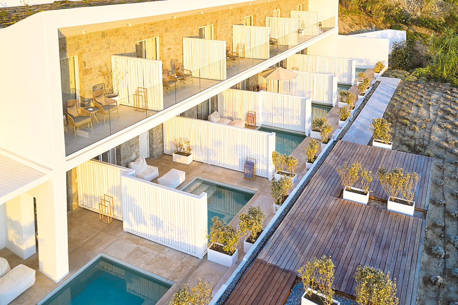 Οι επισκέπτες μπορούν να επιλέξουν ανάμεσα σε 59 κομψά δωμάτια και σουίτες -τα περισσότερα με ιδιωτική πισίνα- διακοσμημένα σε μινιμαλιστικό κυκλαδίτικο στυλ και εξοπλισμένα με πολυτελείς παροχές. Κάθε χώρος διαμονής αποπνέει άνεση και διακριτική πολυτέλεια, ενώ η μαγευτική θέα στην παραλία του Ορνού συμπληρώνει τη συνολική εμπειρία με τον ιδανικό τρόπο.