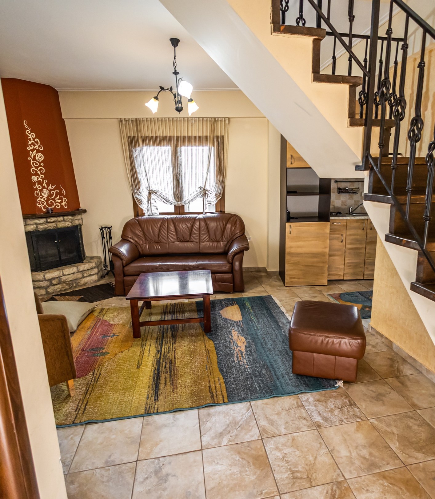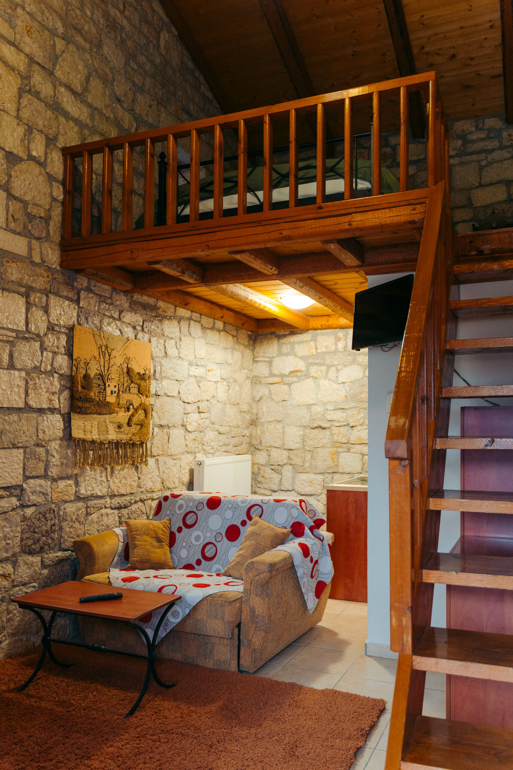 Τα πέτρινα δωμάτια είναι διακοσμημένα με ζεστά χρώματα και διαθέτουν σαλόνι με καναπέδες και αυτόνομη θέρμανση, ενώ όλα τα δωμάτια περιλαμβάνουν τζάκι, γεγονός που καθιστά το ντεκόρ ιδανικό για ζευγάρια.