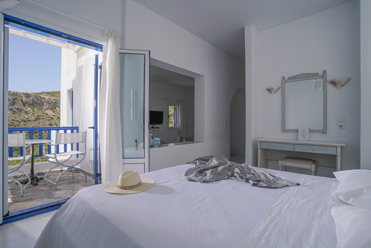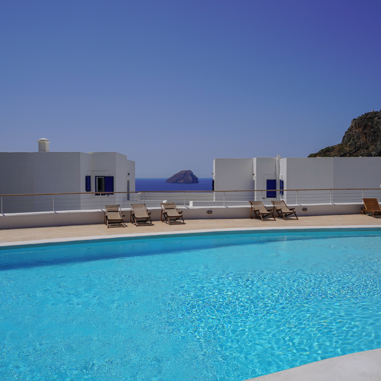 El Sol. Με θέα στη Χώρα και στη θάλασσα, πισίνα και δωμάτια διαφόρων τύπων απλά διακοσμημένα.