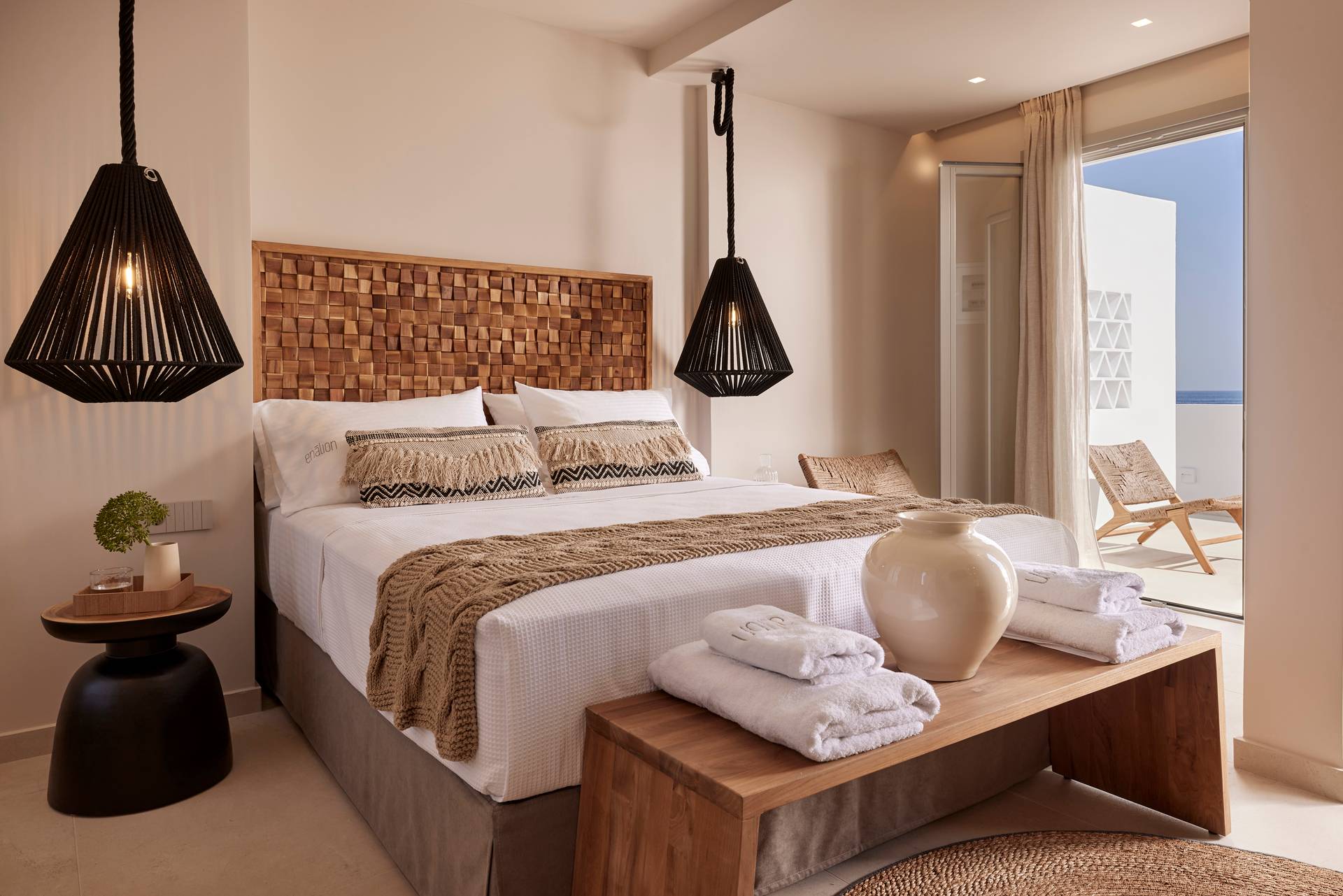 Enalion Suites: Μοντέρνα παραλιακή μονάδα με καλόγουστες σουίτες που έχουν μίνιμαλ στυλ με boho στοιχεία και βεράντες με άπλετη θέα στη θάλασσα.