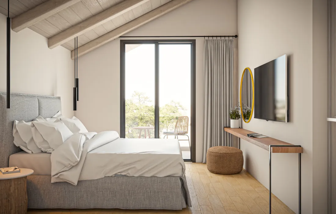 Atlanntica Eleon Grand Resort: μέλος της αλυσίδας που έχει διάφορα ξενοδοχεία σε Ελλάδα και Κύπρο, είναι πέντε αστέρων, κτισμένο κλιμακωτά με πισίνες, κήπους και θέα στη θάλασσα. Έχει δωμάτια διαφόρων τύπων για ζευγάρια και οικογένειες, εστιατόρια και μπαρ.