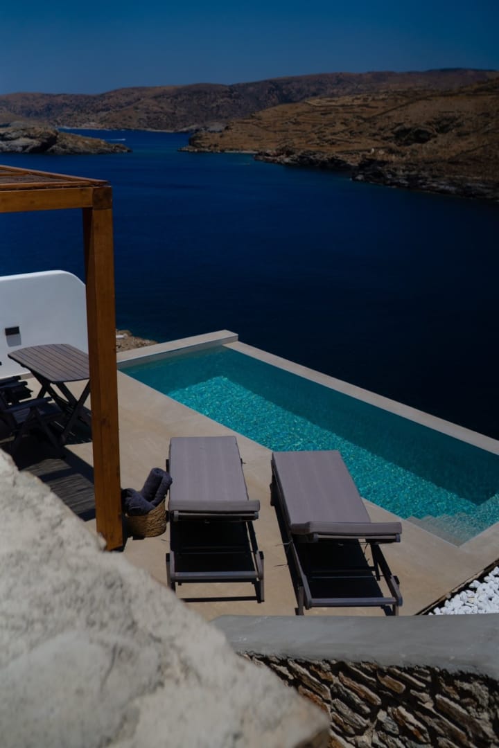 Ble Kythnos Suites. Eξοπλισμένες σουίτες με ωραία θέα στη θάλασσα και ιδιωτική πισίνα.