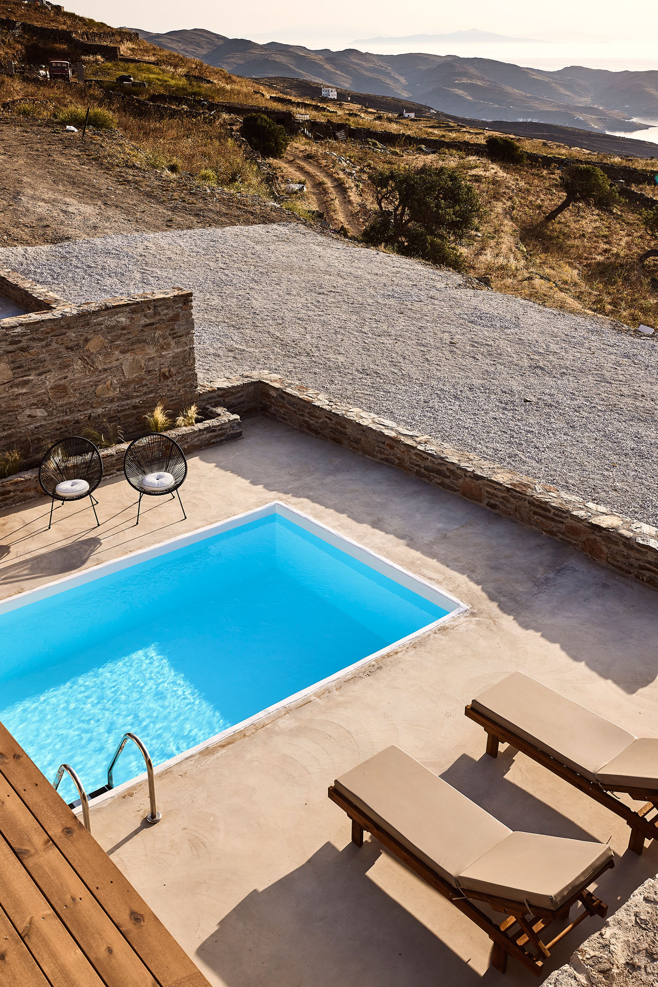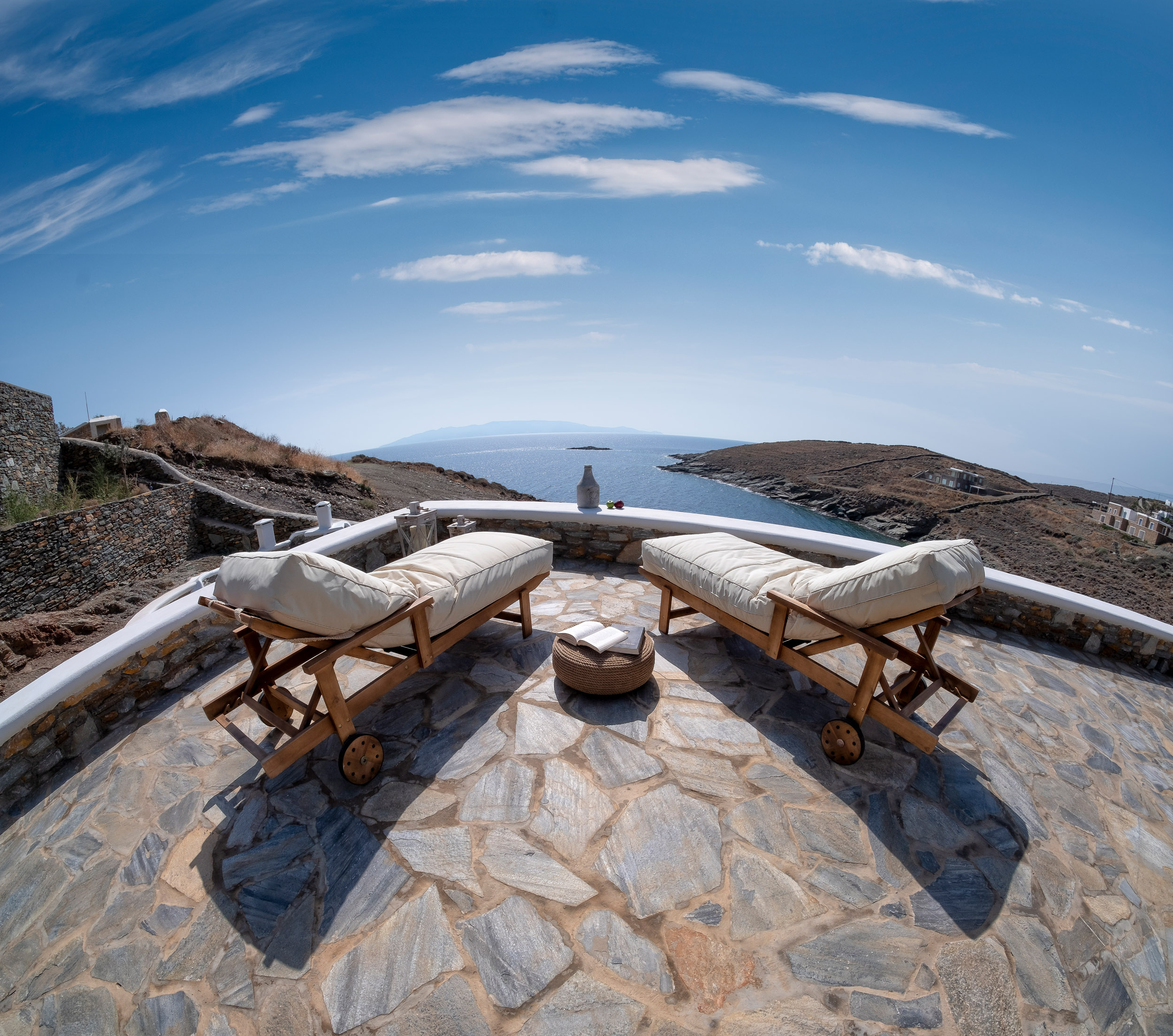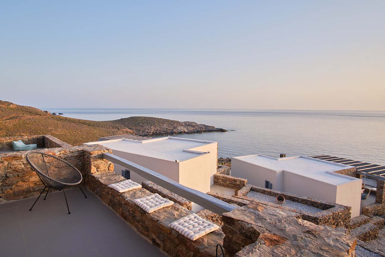 Onos Luxury Villas Kythnos. Τρεις πολυτελείς βίλες με πισίνες, κοντά στην παραλία Σιμούσι. Είναι φτιαγμένες με σκούρη πέτρα, πλήρως εξοπλισμένες, με υπέροχη θέα από τις επιπλωμένες σκεπαστές βεράντες.