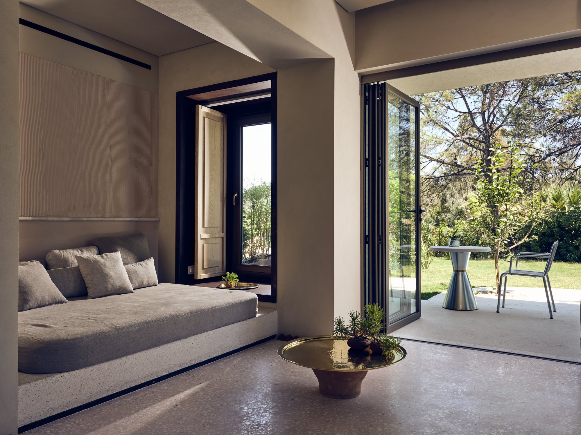Design, χιούμορ, εκπλήξεις. Είναι τo τρίπτυχο που σφραγίζει το ύφος του resort πάνω στη σχεδόν ιδιωτική αμμώδη παραλία. Στην αγκαλιά του πευκοδάσους που φτάνει μέχρι τη θάλασσα, με κήπους γεμάτος λουλούδια και μίνιμαλ σχεδιασμό έχει αναφορές στη φιλοσοφία του feng shui και οικολογικές ευαισθησίες που εκφράζονται στην πληθώρα των φυσικών υλικών. Χαλαρή οικειότητα στους κοινόχρηστους χώρους που επαναλαμβάνεται και στα δωμάτια, με την cool διακόσμηση που φλερτάρει με μια σχεδόν παιδική αθωότητα σε συνδυασμό με design κομμάτια των Arad, Starck, O’ Ghery και Castiglioni.
