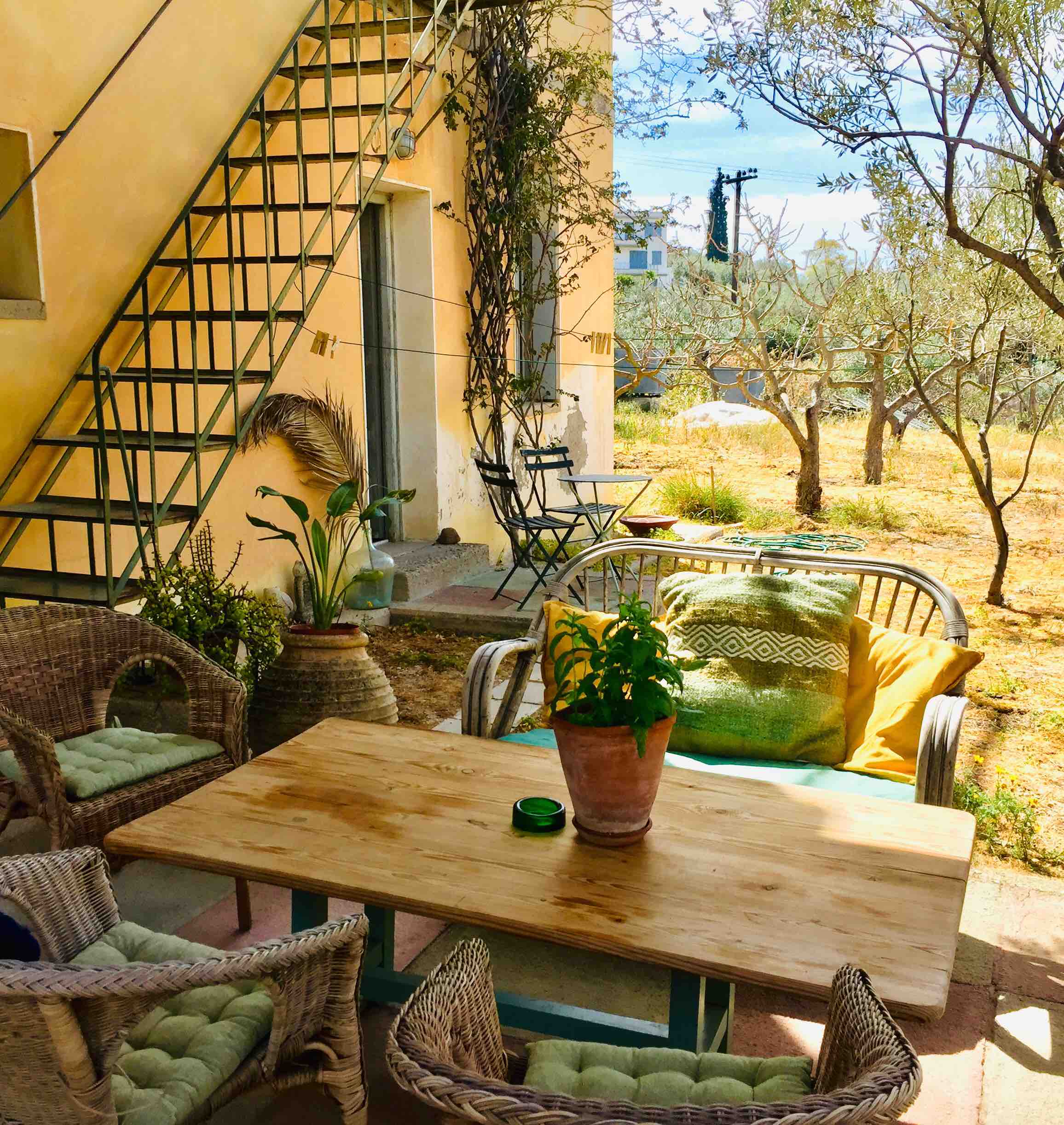 Το ιδιαίτερο σχέδιο του σπιτιού θα σας γοητεύσει με την πρώτη ματιά, αφού μια εξωτερική γέφυρα από μέταλλο και ξύλο συνδέει το ισόγειο με τον επάνω όροφο. Η όμορφη βεράντα, η πράσινη κουζίνα που είναι λουσμένη στο φυσικό φως, οι μοναδικοί υπαίθριοι χώροι και ο κήπος με τα φιστικόδεντρα ολοκληρώνουν το σκηνικό που θυμίζει ευρωπαϊκό ρομαντικό σινεμά.
