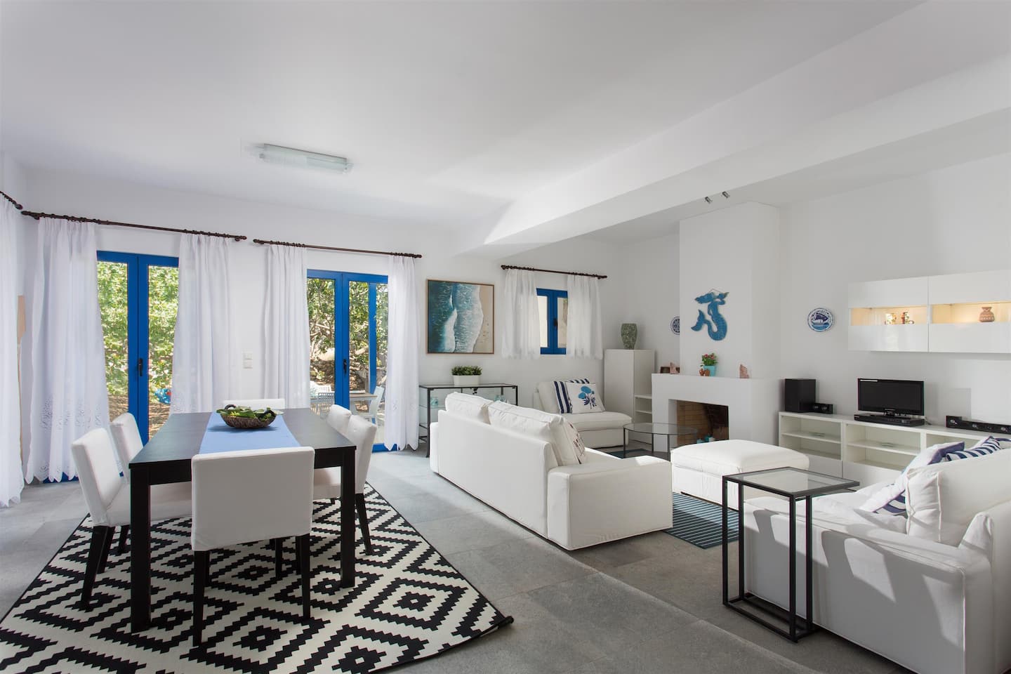 Ένα υπέροχο σπίτι που μυρίζει θάλασσα, γεμάτο μοναδικά έπιπλα από ξεβρασμένο ξύλο, με μπλε και γαλάζια διακόσμηση, μεγάλα παράθυρα με θέα θάλασσα και πολύ φως, καθώς και μια τεράστια βεράντα με άνετους καναπέδες, πολυθρόνες και ξαπλώστρες.