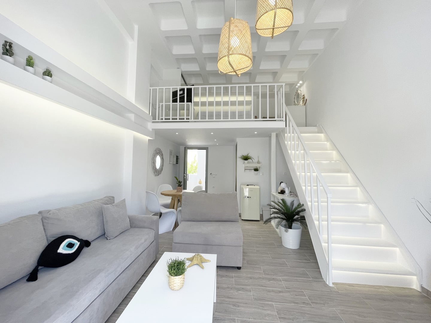 Στο σπίτι κυριαρχεί το λευκό και το γκρι. Το καθιστικό είναι πολύ ευρύχωρο και περιλαμβάνει τραπεζαρία για τέσσερις. Στην κουζίνα θα βρείτε οτιδήποτε μπορεί να χρειαστείτε, ενώ υπάρχουν και βρεφική κούνια και καρεκλάκι μωρού. Στην πίσω πλευρά θα βρείτε το όμορφο μπαλκονάκι, αρκετά γοητευτικό με το βραδινό του φωτισμό.