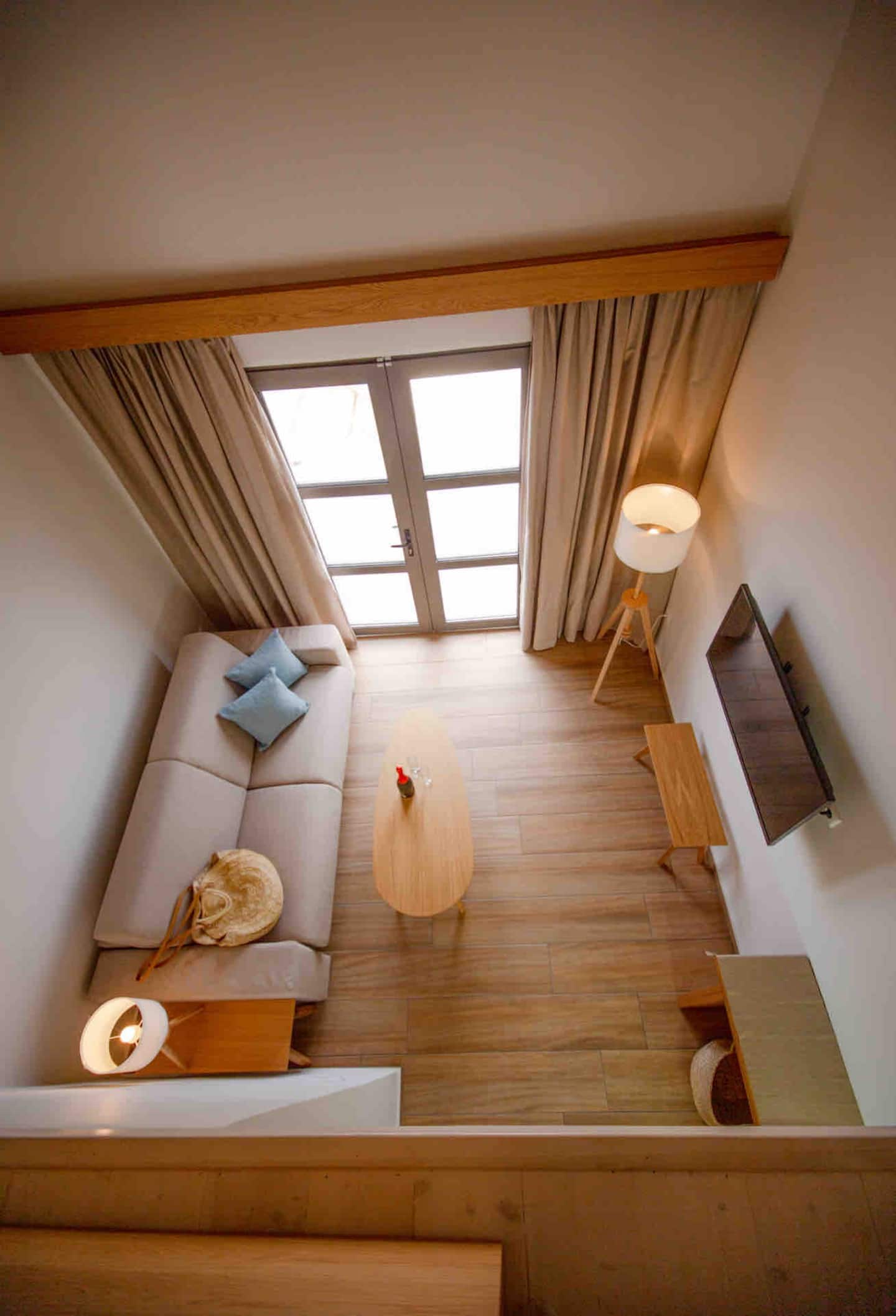 Το queen size κρεβάτι είναι στο πατάρι, μαζί με ένα καλαίσθητο καναπέ-κρεβάτι. Το μπάνιο είναι όλο ξύλινο και πολύ όμορφο. Η κουζίνα είναι μικρή και σας παρέχει τα βασικά. Η διαμονή εδώ περιλαμβάνει πρωινό, ενώ υπάρχει και ιδιωτικό πάρκινγκ.