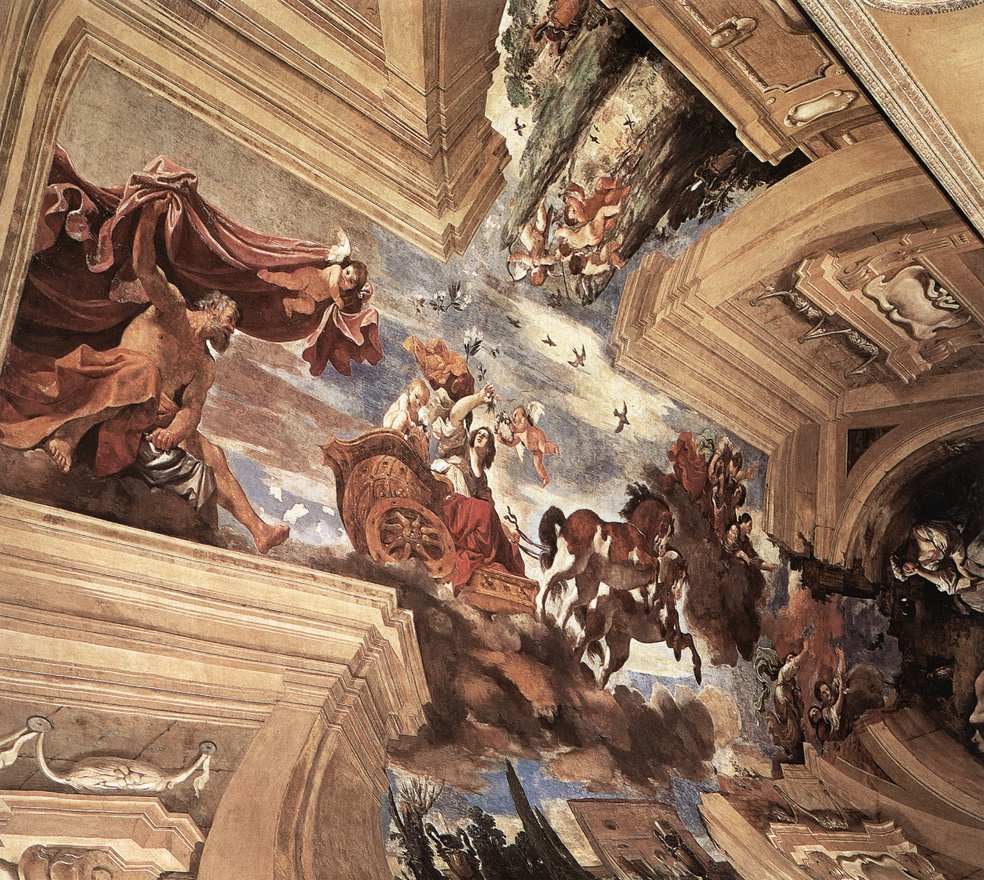 Η οροφογραφία του σπουδαίου εικαστικού φιλοτεχνήθηκε το 1957 και απεικονίζει τους αρχαίους θεούς Δία, Ποσειδώνα και Πλούτωνα να εκπροσωπούν τα τρία σημαντικότερα στοιχεία του σύμπαντος. Αέρα από τον Δία, νερό από τον Ποσειδώνα και γη από τον Πλούτωνα. Το παράξενο είναι ότι αυτό το εκπληκτικό και μοναδικό στον κόσμο έργο τέχνης κάποτε καλύφθηκε με μπογιά για να αποκαλυφθεί ξανά χάρη στη φθορά του χρόνου το 1960. Τότε ήταν η ιστορικός τέχνης Τζιουλιάνα Ζάντρι, η οποία συνειδητοποίησε πως ο Καραβάτζιο είχε απεικονίσει τον εαυτό του σε κάθε μία από τις μορφές των τριών θεών του Ολύμπου.