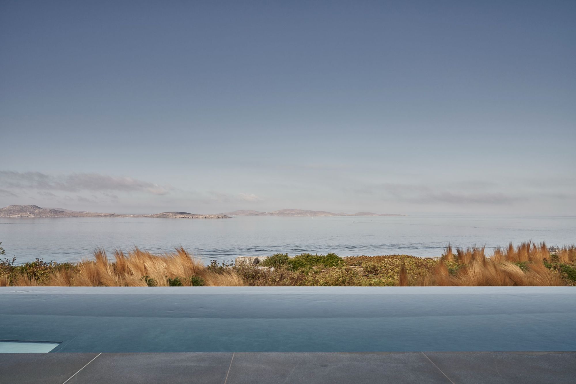 Το μεγάλο πλεονέκτημα της βίλας είναι ότι ατενίζει στη θάλασσα και το ηλιοβασίλεμα πάνω από το γειτονικό νησί της Δήλου και την υψηλότερη κορυφή του, το όρος Κύνθος, σε ένα από τα σπάνια «κινηματογραφικά» σκηνικά των Κυκλάδων.
