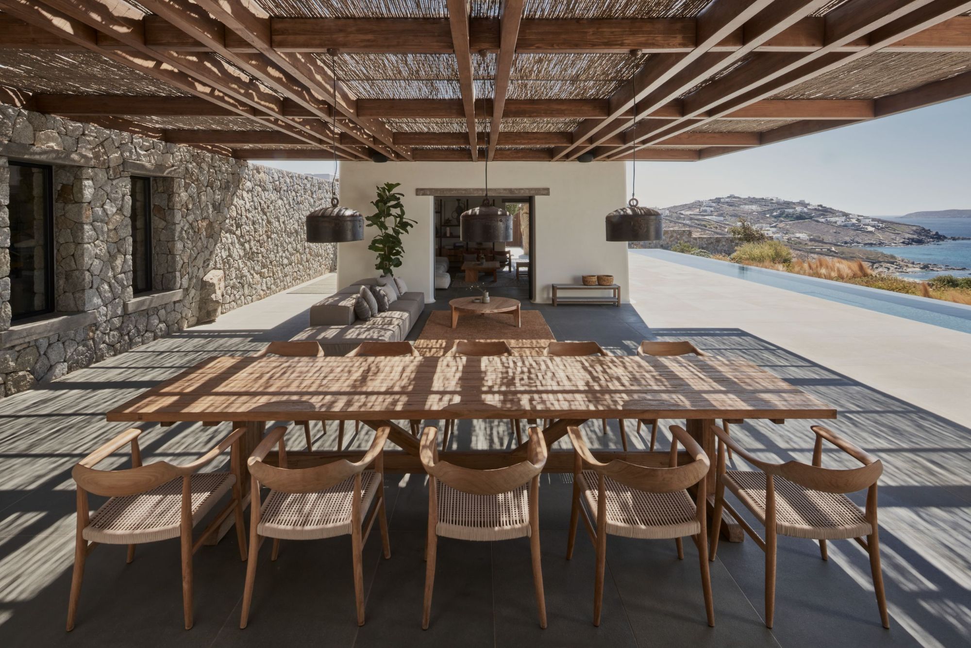 Αυτή η αυλή γίνεται το επίκεντρο του σπιτιού, που συνδέεται άψογα με το σαλόνι και την κουζίνα και βλέπει στην πισίνα και τους κήπους που εκτείνονται πέρα από αυτήν.